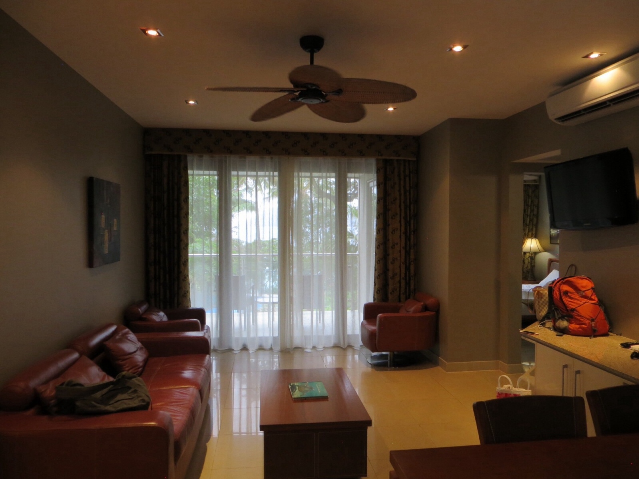 部屋は、コネクニングルームといっても部屋内で繋がっているわけではなく、隣同士の部屋という感じ。海側は広いLDKが付いた開放的な部屋でしたが(写真参照)、通路側のワンルームは風通しも悪く暗い閉鎖的な空間(しかもカビ臭い)だったので、正直、格差がありすぎでした。