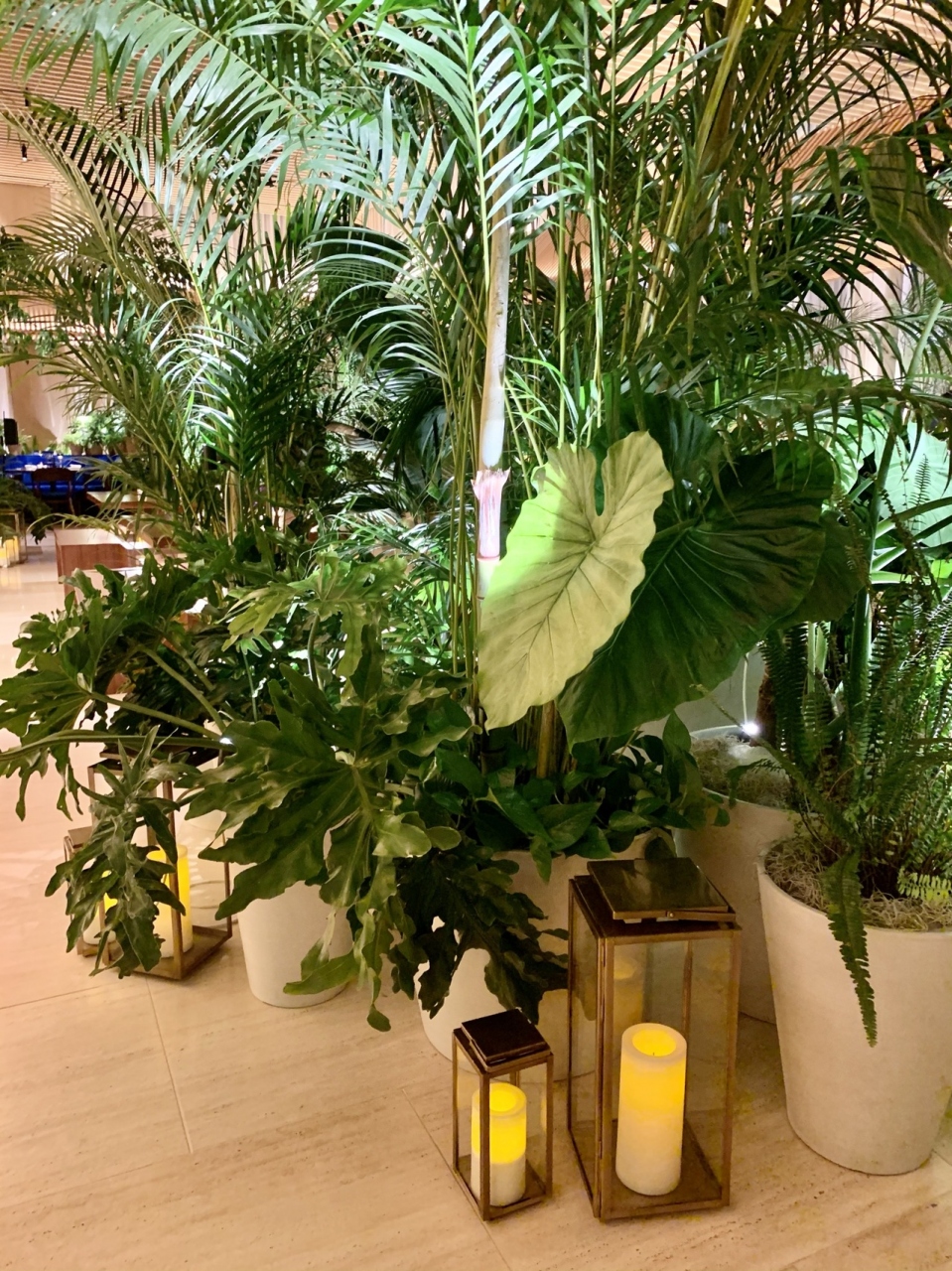 山盛りの観葉植物は、明るい時間帯には清々しく見え、夜には照明も暗くなり、ランタンや多数のキャンドルで怪しげ(?笑) にも見えます。