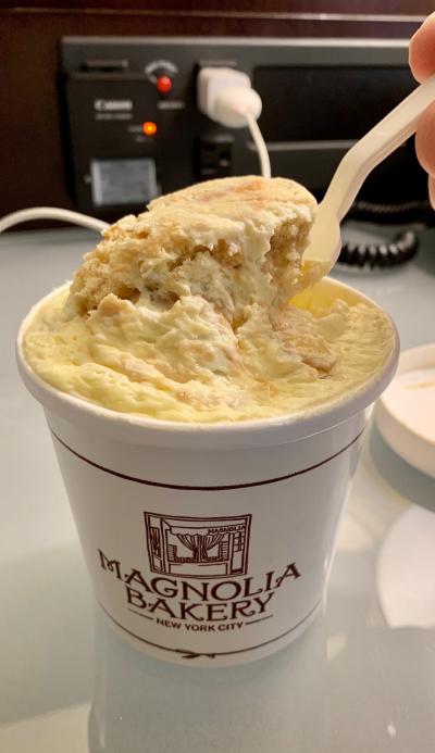 カラフルな可愛いカップケーキがアメリカっぽくって有名みたいなのですが、店内ではバナナプディングを頼んでいる人が多くて(並んでいる内に分かったコト)、私もMサイズ$6をテイクアウト。