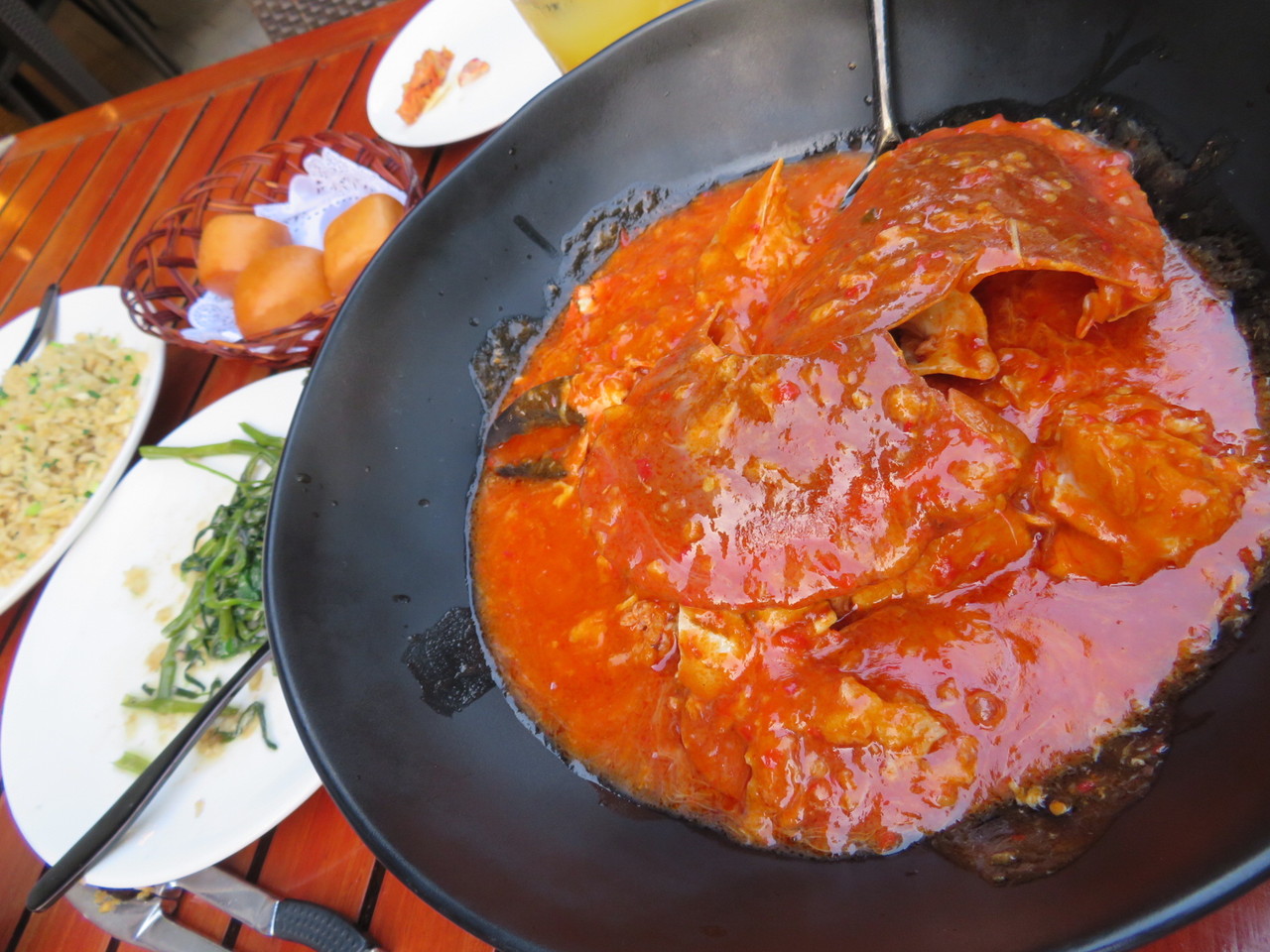 そして、肝心のチリクラブのオーダーの仕方なのですが、店員さんにアドバイス(英語)をして貰いながら、2人で食べれる位の小さいサイズを強調する程度で、重さとか時価とかピンときません。一杯約SGD80前後と見積もりオーダー。