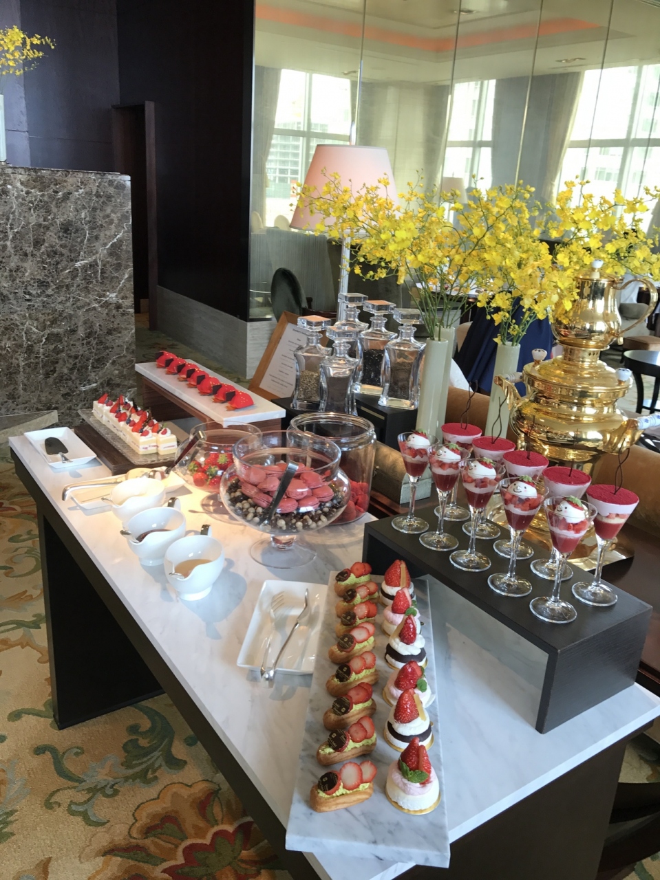 場所は、シャングリラ東京の28階 ザ・ラウンジです。このクラスのホテルでは、コーヒー1杯飲んでも1500円+サービス料10%+Tax 位払うことが多いですが、こちらのATは、一休.comなどのネットからの予約だと、2時間飲み放題で4000円ポッキリ!!