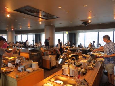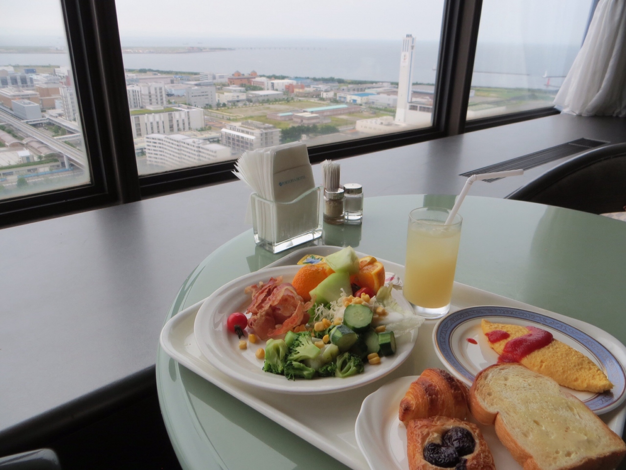 そのため、南側と北側がガラス張りになった贅沢にも一つのガラス空間なため、大袈裟に言えば天空のフロアのようです。昔々(震災前)、夜のバーに訪れた際にその夜景の素晴らしさに感動しましたが、今回は朝食バイキングで利用しました。
