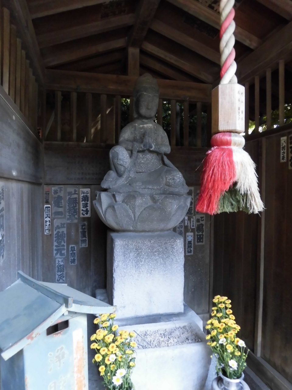 目黒駅から行人坂を下っていく途中、大圓寺山門手前にお社があって、案内板には説明書きも記されていました。お堂の中の石造りの菩薩像は、長い月日によって、かなりお姿も傷んでいますが、それでも仏様の慈悲深いまなざしが感じられて、心穏やかになることが出来ました。