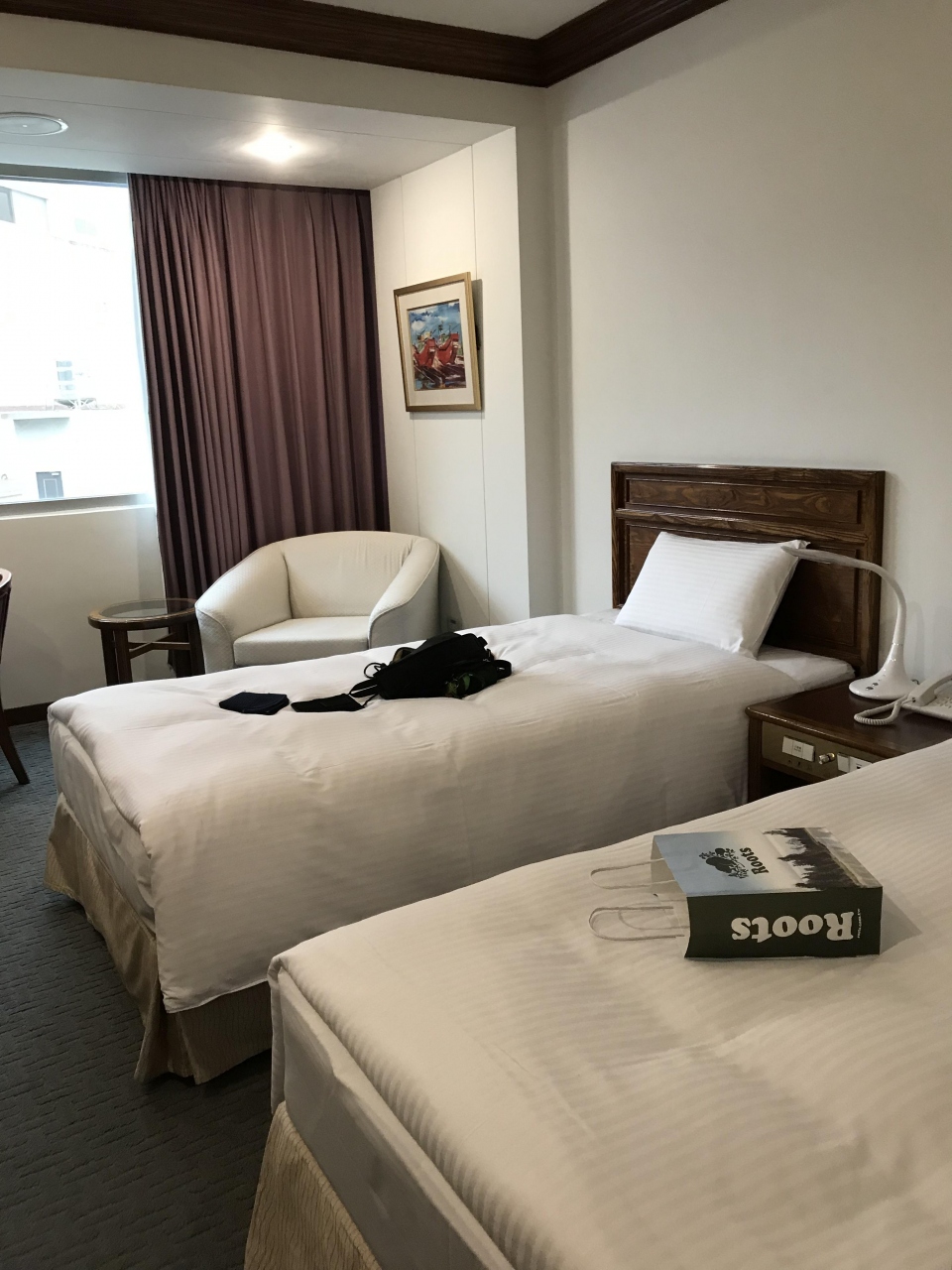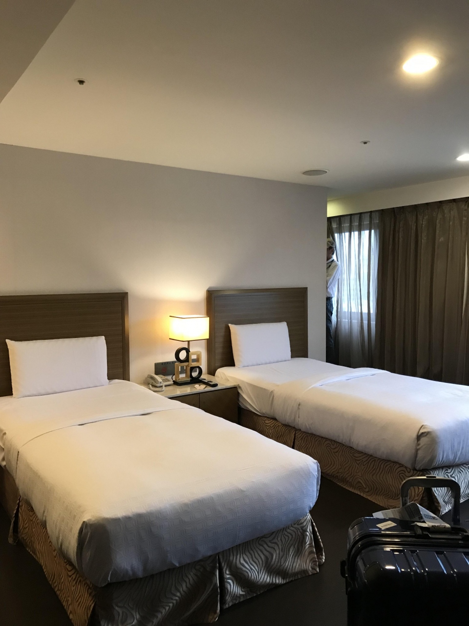 ホテルの手違いがあったので、アップグレードした最上階のデラックスツインにしてくれました。部屋の飲み物は、ビールも含めて無料でした。