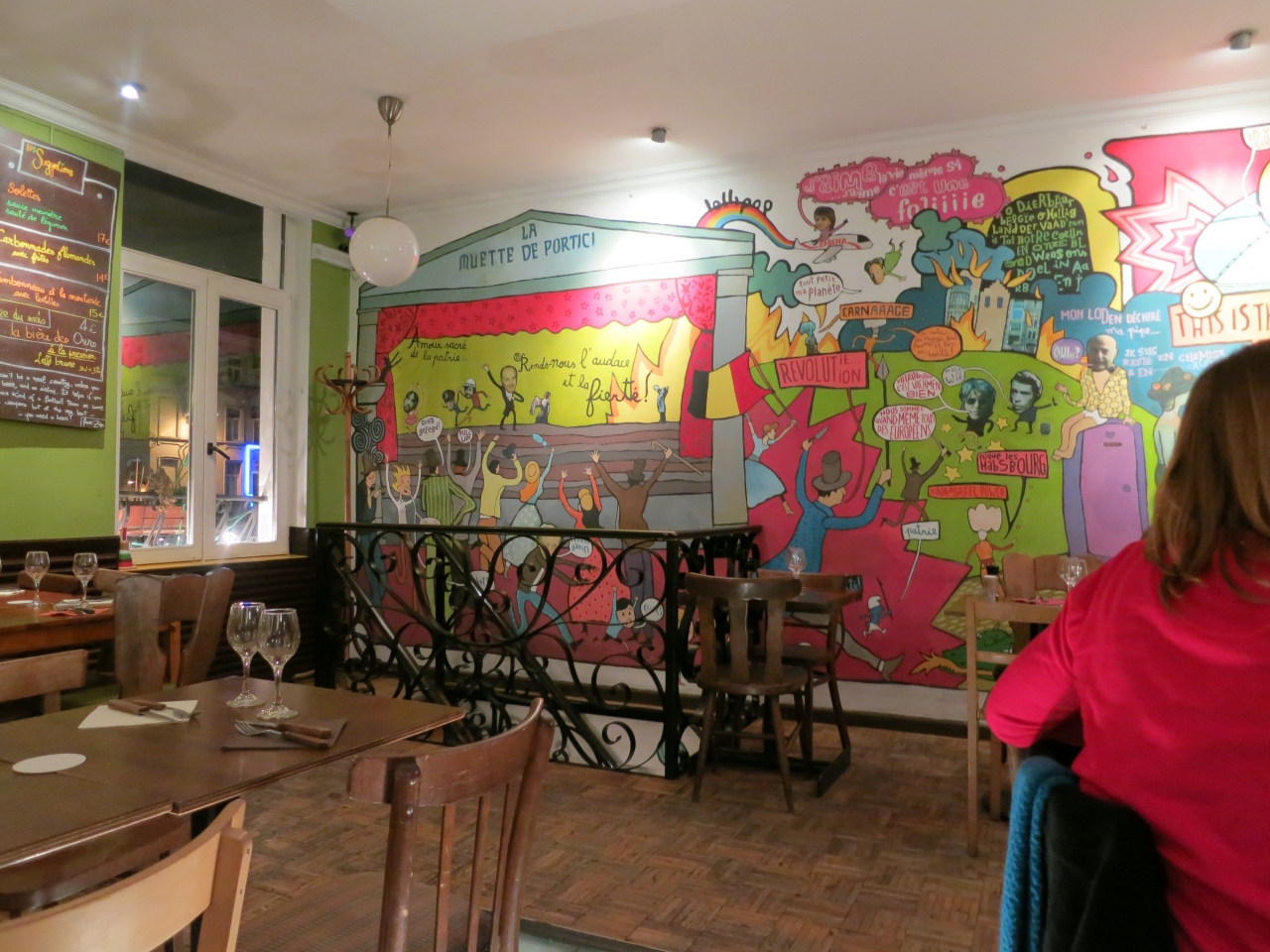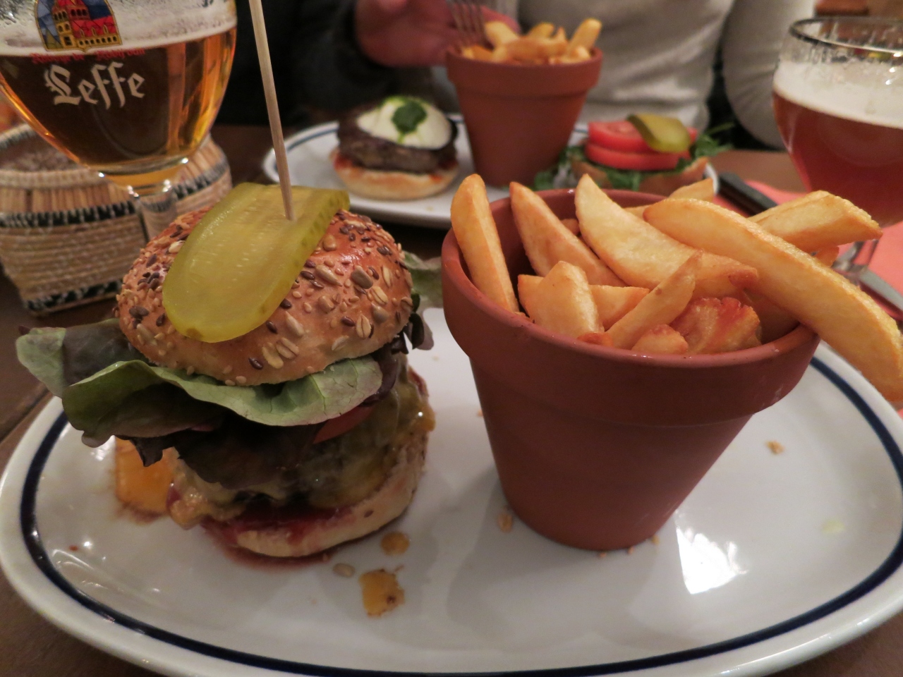 宿泊したホテルの向かい側にあったので便利でしたが、グランプラスやサブロン広場からはだいぶ離れています。しかし、少々の地の利の悪さは関係なく店内は賑わっていました。各種ハンバーガーはそれほどバカでかくはないですがお野菜もたっぷりでボリュームは十分。フライドポテト(こちらではフリッツと言うのでしょうか)はなんと植木鉢に入って出てきます。店内はポップな絵が描かれていて明るい雰囲気です。場所は南駅とグランプラスのちょうど中間地点、どちらからも歩いて約15分程度のところです。