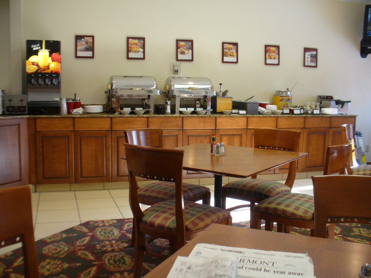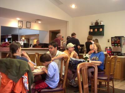 i89とルート2Aの交差点にあるマリオット系列のチェーンホテルですが、ここのユニットは4部屋が一つの独立した二階建てユニットになっていて、一階も二階も隣の部屋の入り口は反対側になっているので、隣の人と顔を合わせることはありません。部屋にはキッチン、冷蔵庫、電子レンジ、オーブン、食洗器なども完備していて長期の滞在にも問題はなさそうです。ロビー近くにラウンジでは毎朝無料の朝食が食べられます。暖かい卵焼きやソーセージ、ベーコンの他パンやシリアルも選べます。プールやエクササイズできるフィットネスルームもあります。