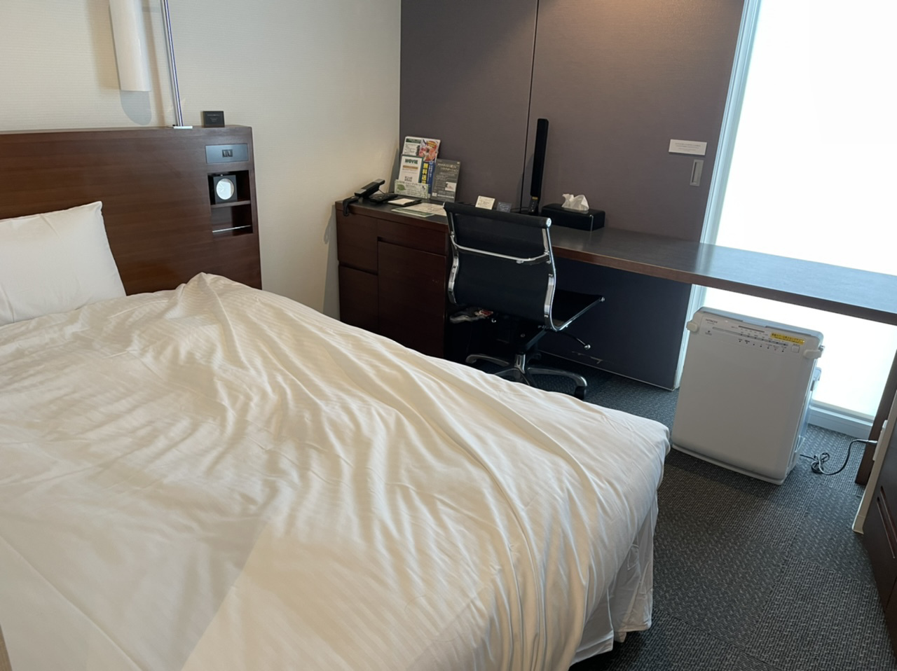ツインルームに宿泊しました。ベッドもお部屋も広く2人分の荷物を広げても十分にスペースがありました。お部屋に冷蔵庫があり缶のミネラルウォーターが無料でした。