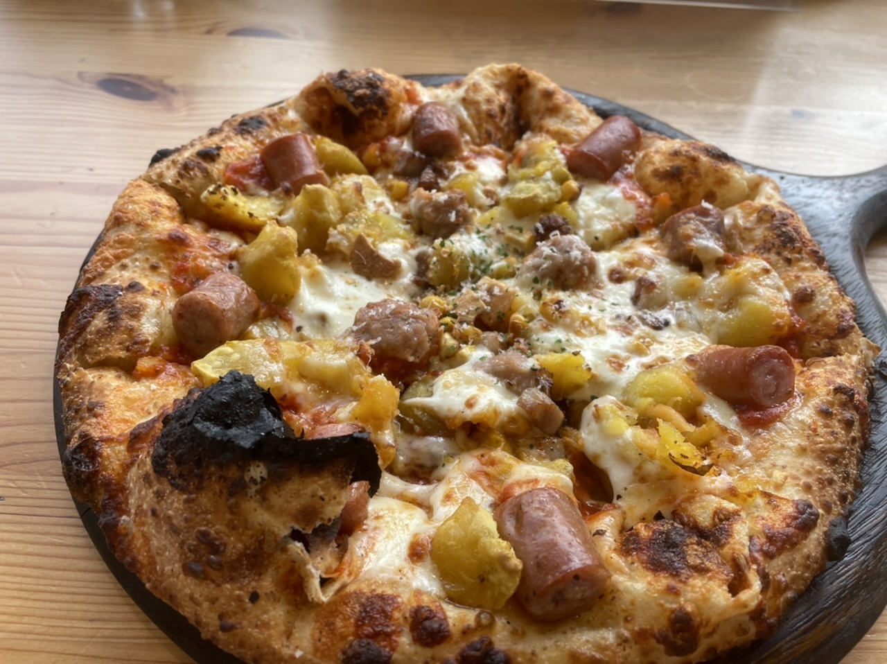 ザクセンという北海道産のほくほくのインカのめざめ、コーン、ジューシーなソーセージがのった美味しいピザを頂きました。記事はふっくらして耳にもチーズがかかっていました。