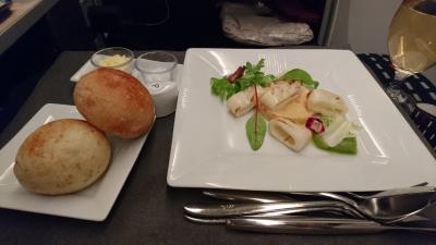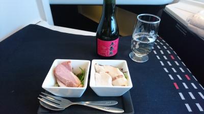 行きの飛行機は洋食を選択。シャンパンを飲み続け就寝。