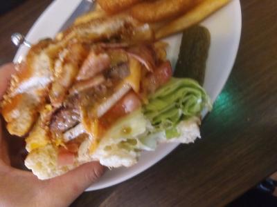赤が基調のレトロな概観、目の前のポストの赤もハマっております。名物はロットバーガー。ランチメニューには無いようですが、頼めば作ってもらえました。10cmを超える高さを目の前にして、まずは食べ方がわかりません。ハンバーグは焼き立てで熱いので、ひと口目は注意ですが、味は絶品。なかなかこういうお店は見ないので、ついつい立ち寄りたくなります。