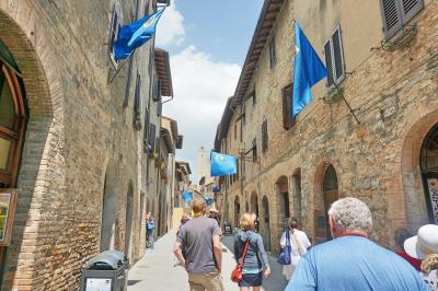 サンジミニャーノの南の入り口、サンジョバンニ門を潜ると、旧市街の中心に向かってまっすぐ延びるサンジョバンニ通りがあります。人気の街なので、多くの観光客で賑わっていて、通りの先に見える通りを歩くと中世の街にタイムスリップした感じがします。