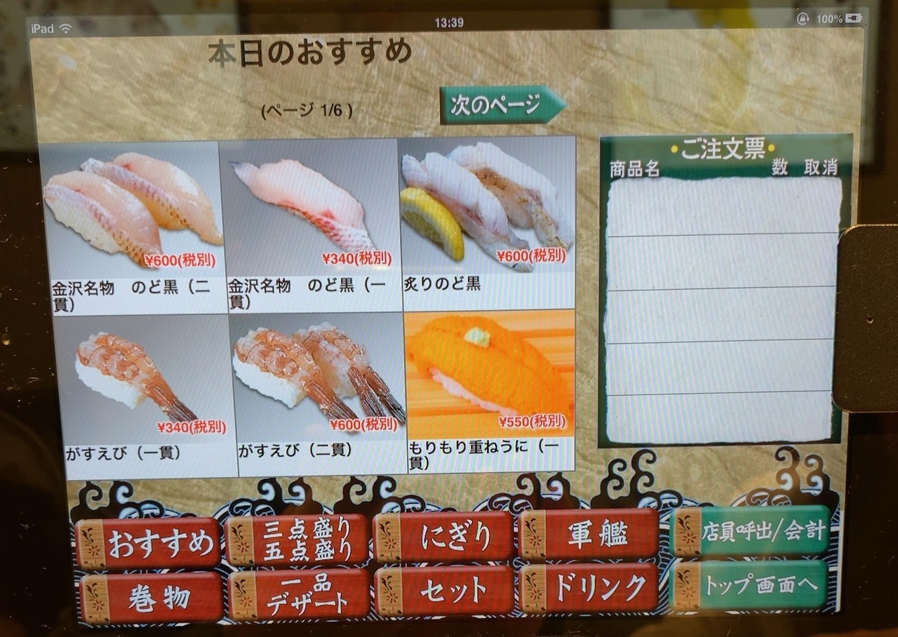 以前、金沢でお寿司を食べたら、東京よりネタが大きくて美味かったので、金沢のもりもり寿司に行ってみました。出店以来、いつも混んでいて躊躇していましたが、13時過ぎていたので、あまり待たずに入れました。シャリが少な目で、ネタが大きくて、つい沢山、注文してしまいました。オーダーはiPadで写真を見ながらできたので、とても良かったです。