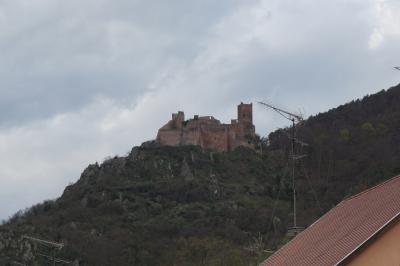 リボヴィレの大通りを歩いていると、正面の山の上に、このサントゥルリッシュ城が見えます。リボヴィレにある3つのお城の一つで、この他にリヴォーピエール城、ギエスベール城というお城があります。ブドウ畑を通って城に登るをよい景色が見えそうです。