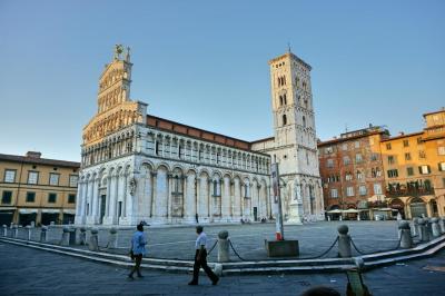 城塞都市ルッカの中心部にあるファザードが素敵なサン ミケーレ イン フォロ教会を訪れました。4層の小柱廊を持つファザードはロマネスク・ピサ・ルッカ様式の最高峰と言われていて、ぜひ写真におさめたいものです。頂上には大天使ミカエルの像が据えられていて、ちょうど西の太陽が当たって綺麗な写真を撮ることができました。