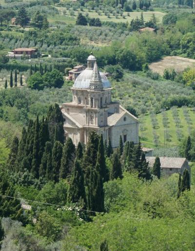 モンテプルチャーノの旧市街は丘の上にあるので、テラスからキアーナ渓谷に佇む白い色が引き立つ教会「マドンナ ディ サン ビアージョ教会」を望むことができます。教会までは旧市街城壁の門を出て、丘を500mくらい下ったところにあります。モンテプルチャーノに1泊して時間があれば訪れたい教会です。