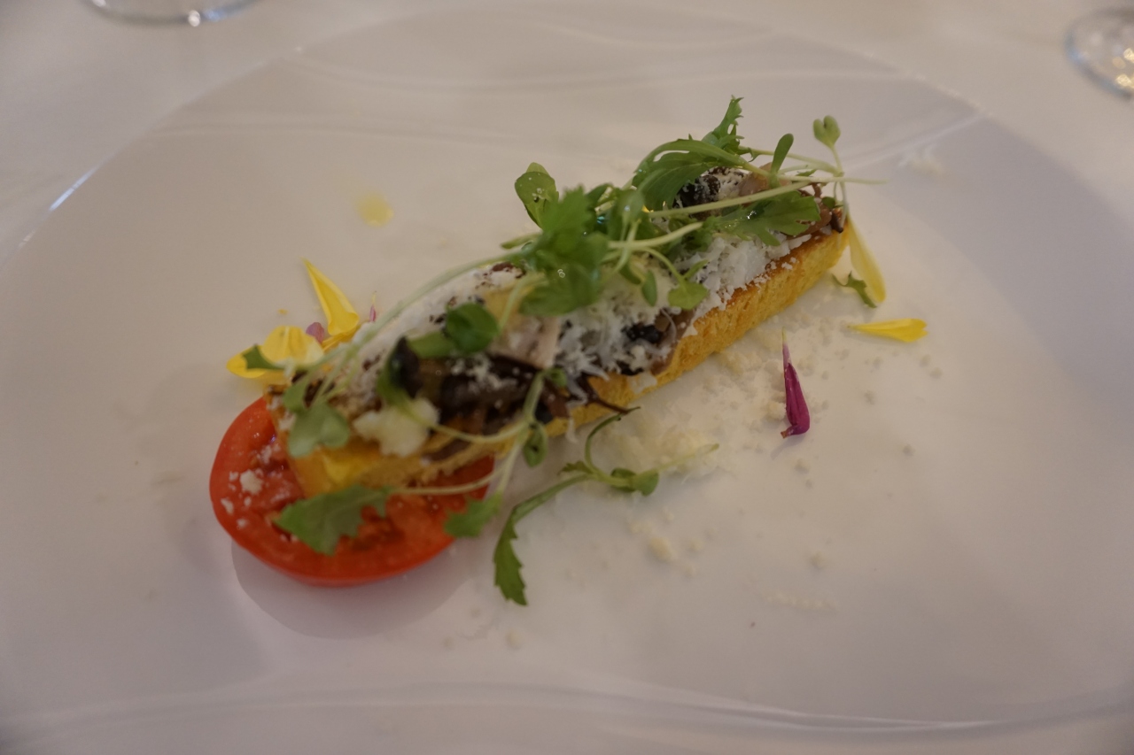 前菜 信州きのこと信州福味鶏胸肉のタルティーヌ エルブドプロヴァンスの香り