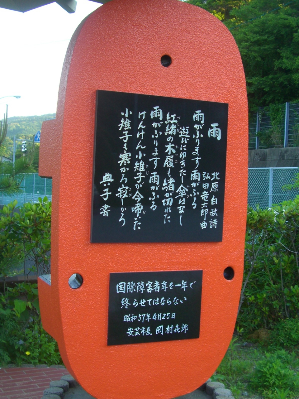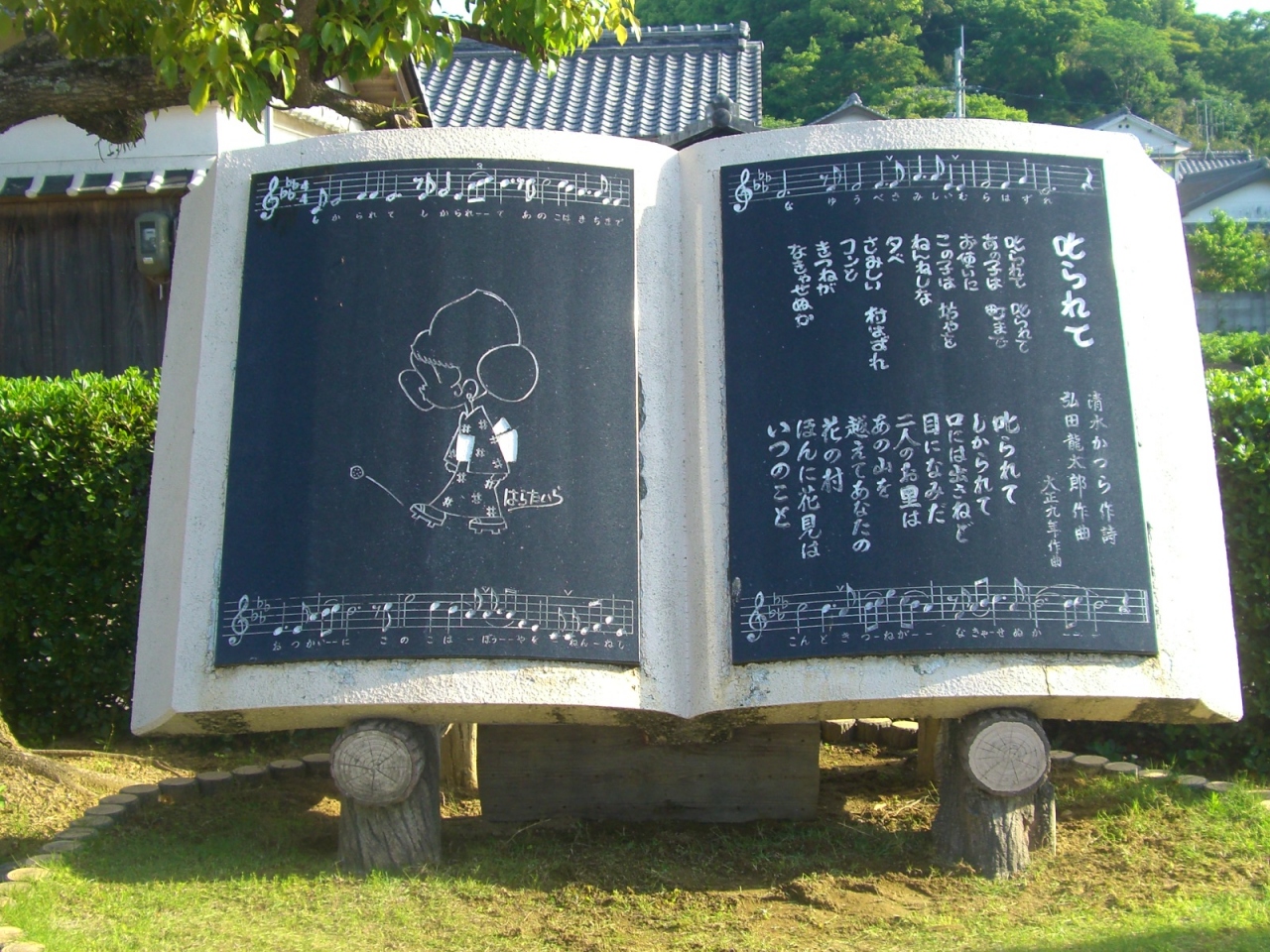 中でも最初に立ち寄ったサリドマイド障害で両手を失った辻典子さん(熊本市役所勤務)が足指で書きこんだと言われる曲碑「雨」は弘田龍太郎、北原白秋(作詞)のコンビ曲60余曲の中でも最も愛唱された歌ですが、これには感動致しました。- 旅行時期