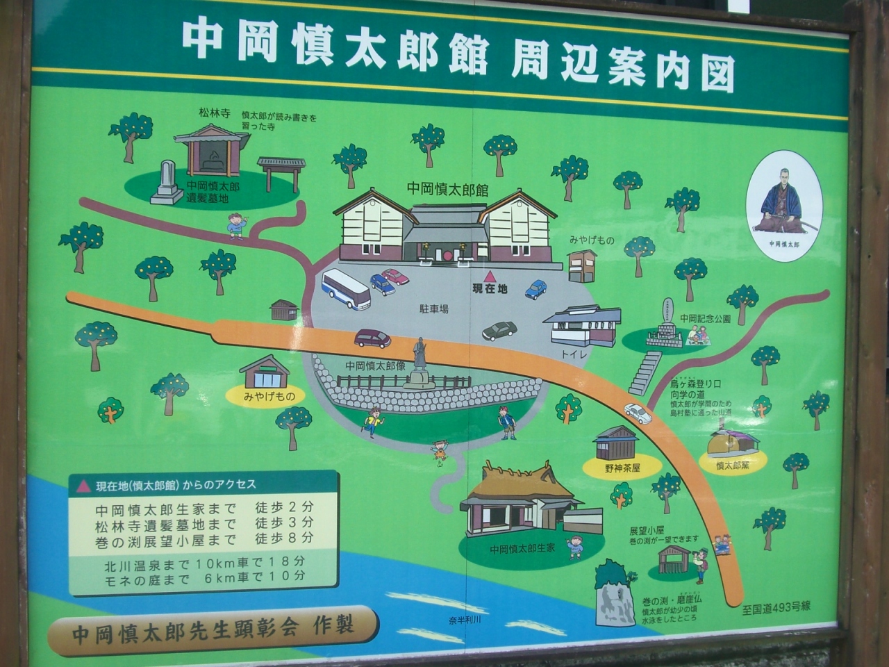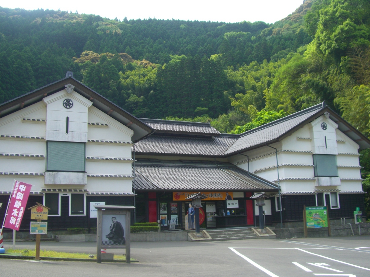 中岡慎太郎館(高知県東部、北川村)に車を駐車し、生家へはここから坂を下ること1~2分と言ったところでしょうか、生家自体は無料ですが、慎太郎館の方は一般(高校生以上)500円、小中学生300円の入館料が必要です。