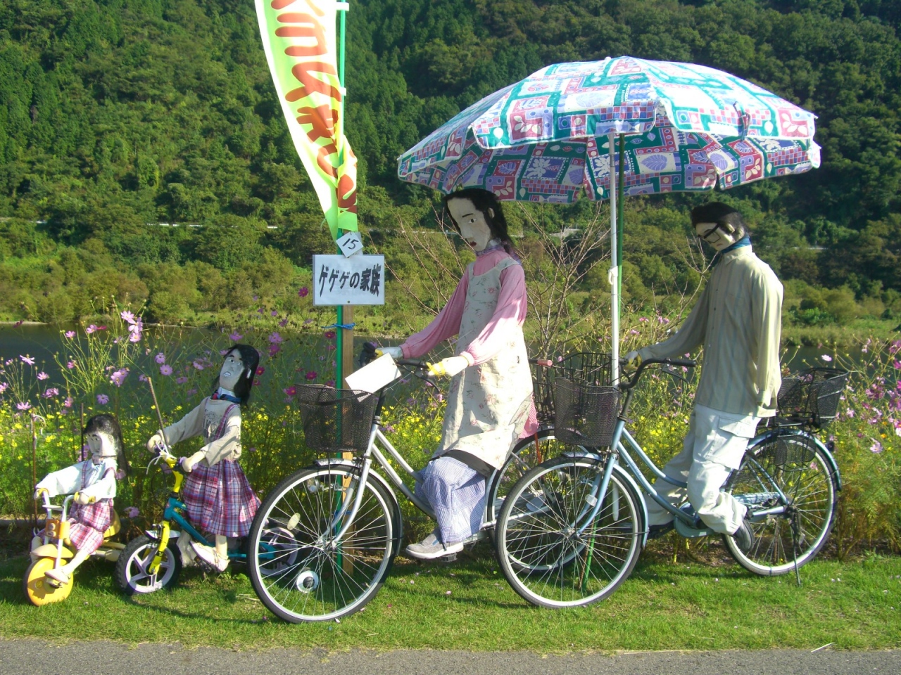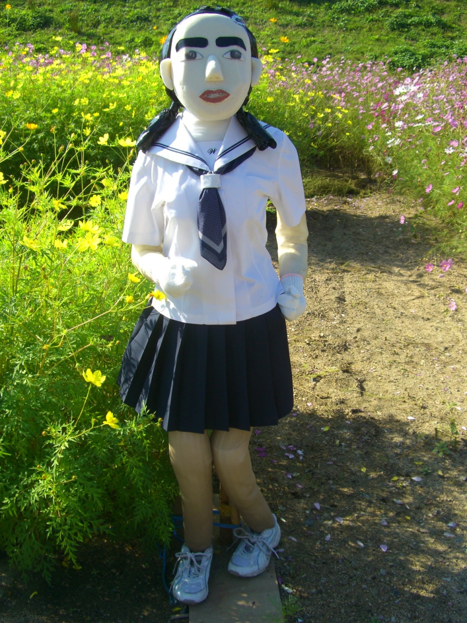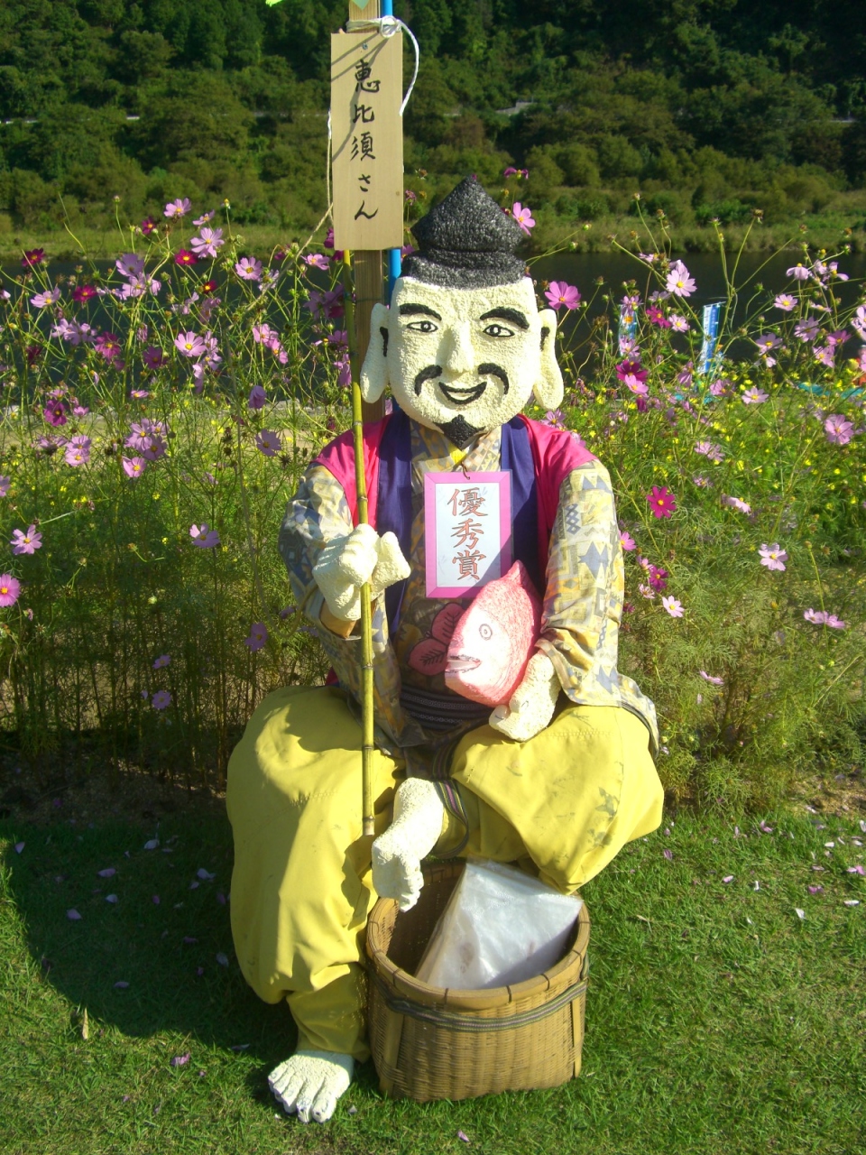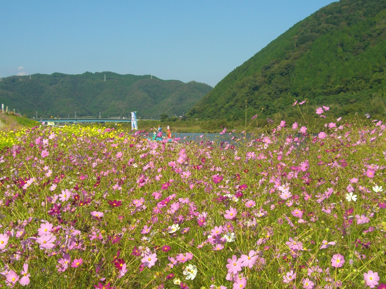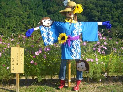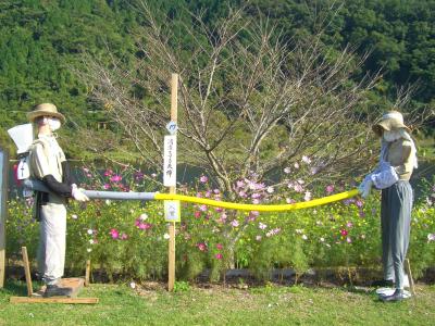 吉井川河畔に広がるコスモスに沿って数十点の同年を象徴する案山子の作品が展示されてています。(10月上旬)