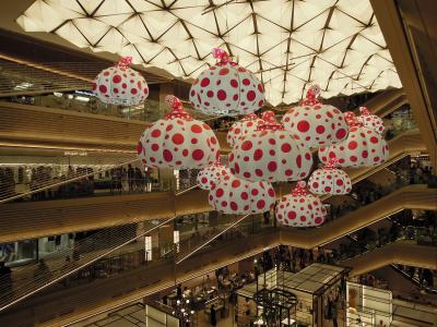 中央の吹き抜けには草間彌生さんの水玉の作品が華やか。