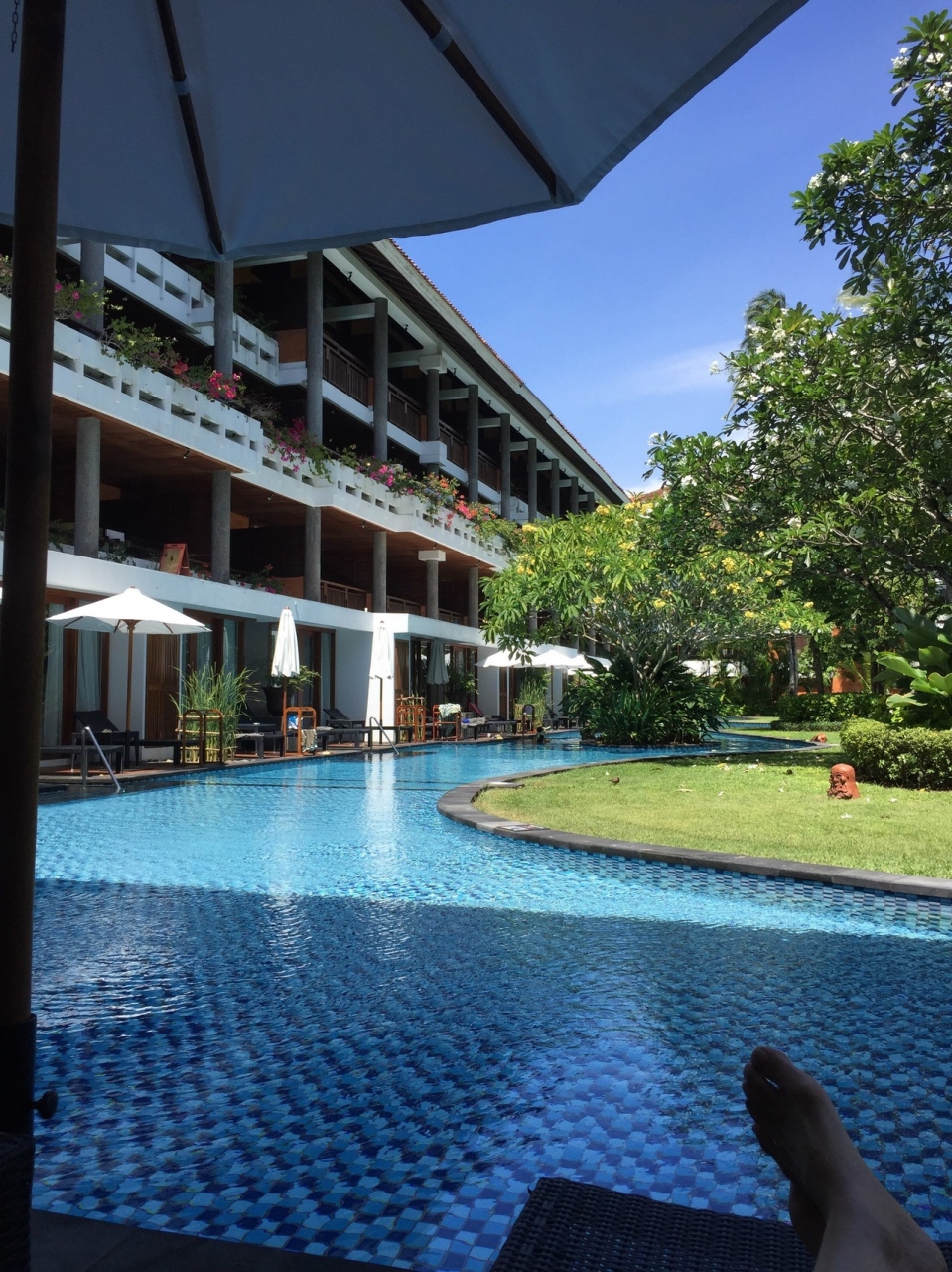 プールに面した1階の部屋のバルコニーから、直接プールに入ることができます。このプールは、一般のプールとは別になっており、プールアクセスルーム専用でした。結構年配の方が宿泊しているせいか、皆さんバルコニーのチェアで本を読んだり、お昼寝したり…。暑くなるとちょっと泳ぐゲストがいるくらいで、静かで落ち着いた雰囲気でした。