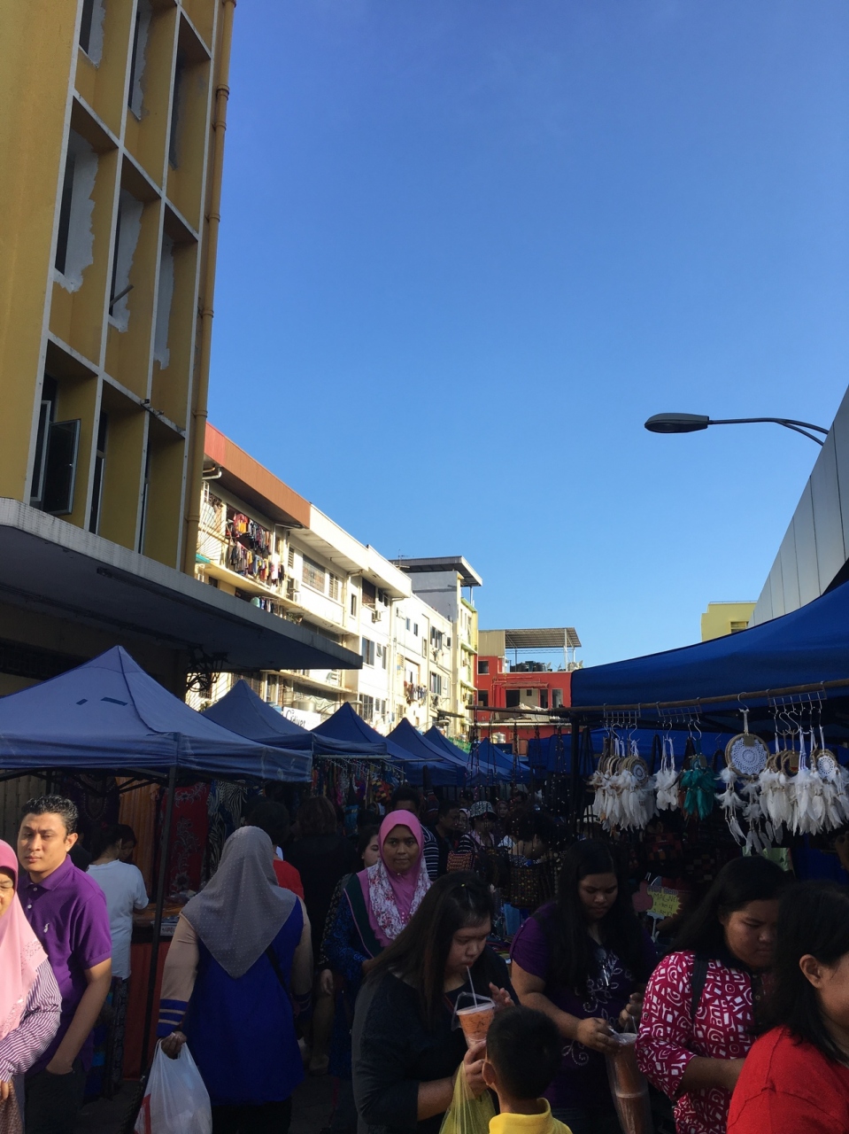 コタキナバル市内のガヤ通りで日曜の朝開催されているマーケット。前日の夜もここに同じような屋台が沢山並んでいました。朝の方が野菜など日用品や食べ物が多い気がします。朝は6時半くらいからオープンしているようですが、10時ごろに行っても賑わっていました。午後は全部閉まって、きれいに掃除している様子が見られました。お店の人たちは午後は休日となるようです。