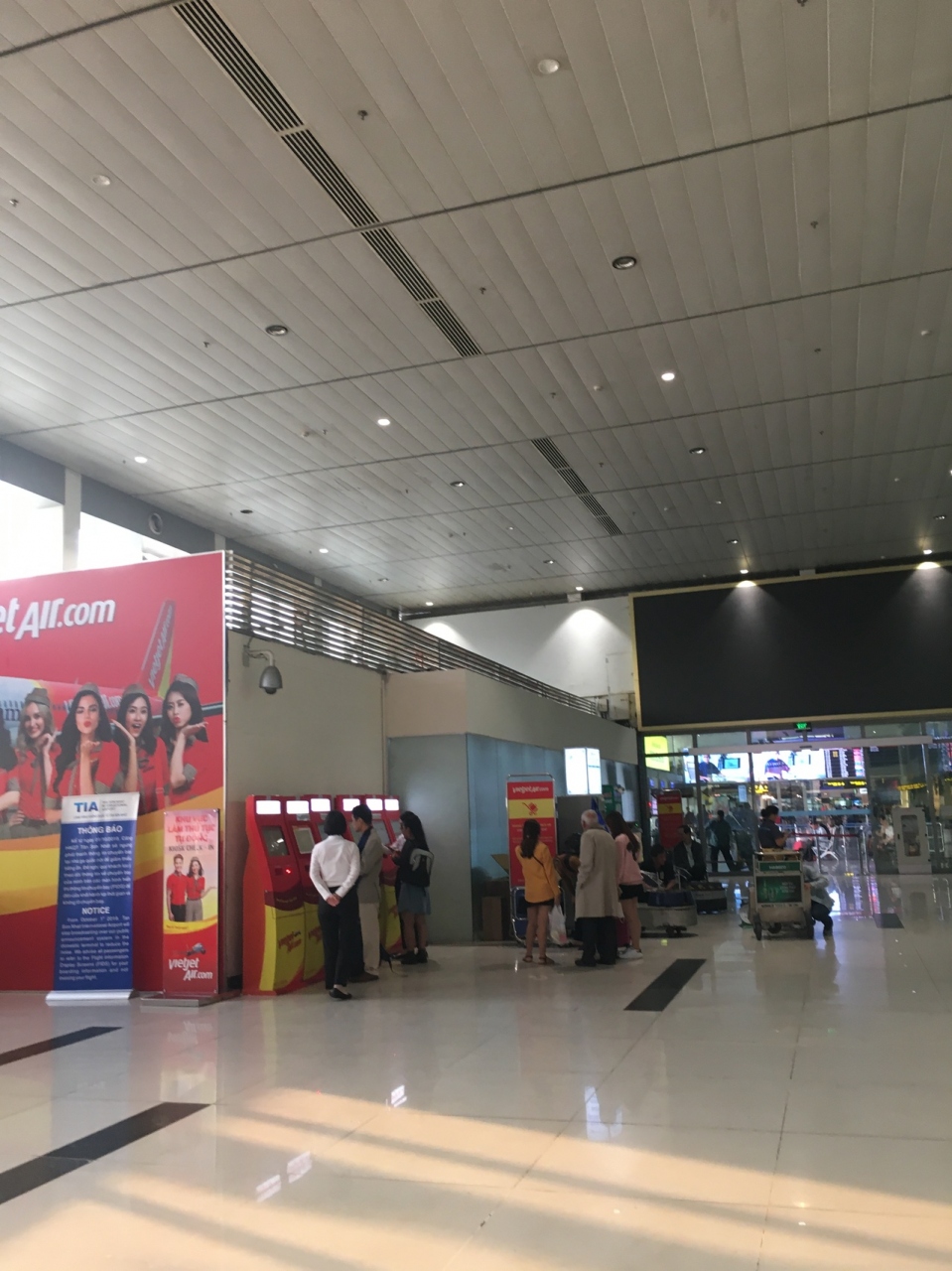 職員を装った白人男性が騙しにきました。Yシャツとスーツを来た、ベトナム航空のロゴの入った無線を持ったいかにも職員のような出で立ちです。後進国の空港、日本の様に大きくない空港ではこんな事もあるのかな、と到着したばかりで、違和感は感じませんでした。今ならおかしいと思えます。想像してください、普通に考えて、日本の空港で出発機の職員が「~航空はこちら」と呼びにきますか?空港の外の建物に?成田や羽田を想像してみてください。遅延などで乗り継ぎの間に合わなさそうな乗客を探すことはありますが、それはあくまで到着ゲートでです。空港の外ではあり得ません。さらに私たちはLCC乗り継ぎだったので、この様な別切りの搭乗券は両航空会社とも関知していないので、探しには来ません。遅延して乗れなくてもNO SHOWという扱いで終わります。その職員のふりをしている人は100%偽者です。無視してください。ただNOと言い続けて歩いて国内線ターミナルに向かえばいいです。