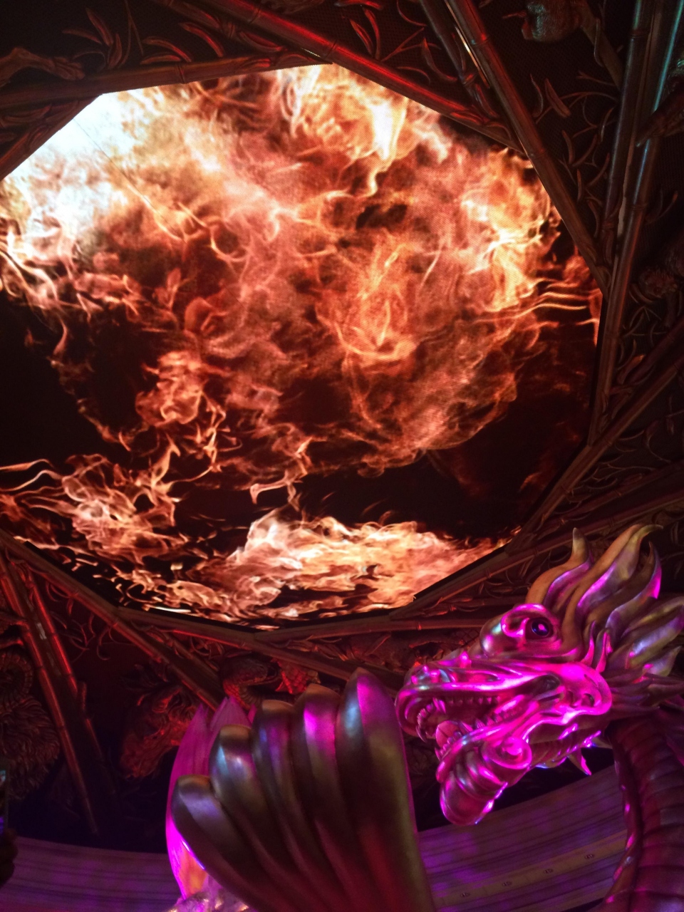 カジノをしに行きました。タイパフェリーターミナルからいろいろなホテルの無料バスが出ています。ウィンマカオホテルも出していて、このバスに乗ってやってきました。ちょっとカジノを見てからメインホールに戻ると、中央の星座をかたどった半円のモニュメントの周りに人だかりができています。天井には十二支の装飾があります。何かショーが始まるのかと待っていたら、半円のモニュメントが割れて、下から大きなドラゴンが!さらに上の十二支も割れて、炎が見えます。数分間のショーが、一日何度かあるのでしょう。突然始まったショーで、驚きましたがとても楽しめました。