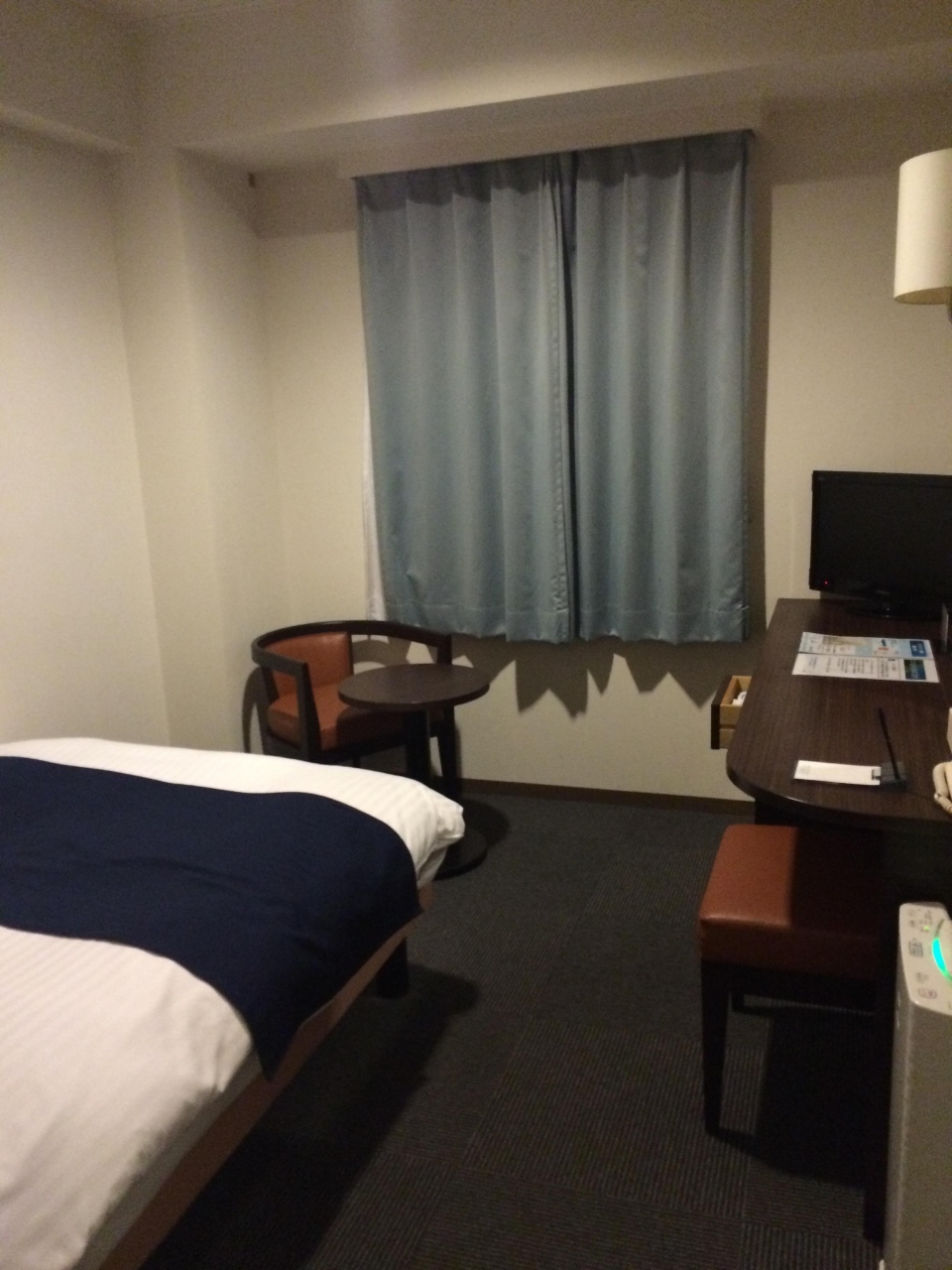 部屋はとても狭いけれど、きれいで清潔な印象でした。レンタカーで行き、最初は駐車場がわからず、脇道に止めてホテルの人に聞くと、すぐ裏手にあるとのことでした。カギを預けてチェックイン。朝食付きのプランで、翌朝は地下の朝食会場で和食を中心にした朝ご飯をいただきました。