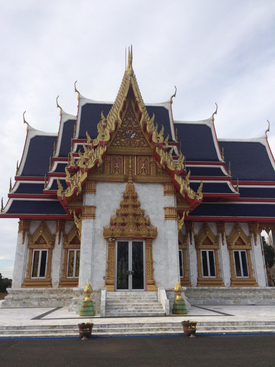 成田にタイのワットパクナムの別院があると知って、お正月休みに訪れました。車とナビがないと難しい地理です。こんなところにあるの?というような田んぼがずっと続き、すれ違えない狭い道路を通って突然カラフルな寺院が現れます。無料で炊き出しをしていて、いただくことができます。お供えをもってきていなかったので、自分の払える値段でその場で用意してもらいます。お坊さんが説教をしてくれますが、なんといっているのかわかりません。でも周りの人と一緒にお祈りします。「ご飯を食べていきなさい」、と身振り手振りで言ってくれて、またいただきました。ものすごい人でにぎわっていましたが、もっと込み合うお祭りの日もあるそうです。