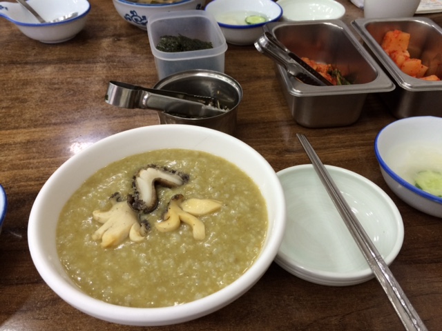 ガイドさんの勧めで、朝はお粥のおいしいお店に行くといい、ということで紹介されたアワビ粥のお店へ。うーん・・・何が特別なのかわかりませんでした・・・アワビの肝が入っているから他と違う、ということでしたが、全く味がしないのです。色が緑色なだけで・・・旦那はウニのスープを頼みましたが、ほとんどがワカメでした。そして値段が高い!1600円くらい?したような気がします。他のお粥を食べていないから比較しようがありませんが、お粥は特に味がなくて、自分でキムチなどを混ぜて味を作って頂くものなのでしょう。初心者には良さがわかりませんでした。