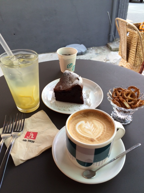 釜山の田浦ストリートはおしゃれな若者たちの街らしい、と聞いて訪れました。まさに芸術家の街といった雰囲気でした。改装中の建物が多く、どんどんカフェができている様子です。テラスでお茶をしたかったので探してみるとCafe Tintoというおしゃれカフェがありました。カプチーノ、ガトーショコラ、レモンスカッシュを頼むとプレッツェルのおつまみが付きました。店員のお姉さんがかわいらしい!韓国語のわからない私たちに、一生懸命片言の英語で対応してくれました。お茶をしていると、外の路地でカメラマンとモデルらしき美人さんが撮影をしています。雑誌の撮影でしょうか。ちょっとおしゃれなカフェを探していたら、田浦に行ってみると楽しいと思います。