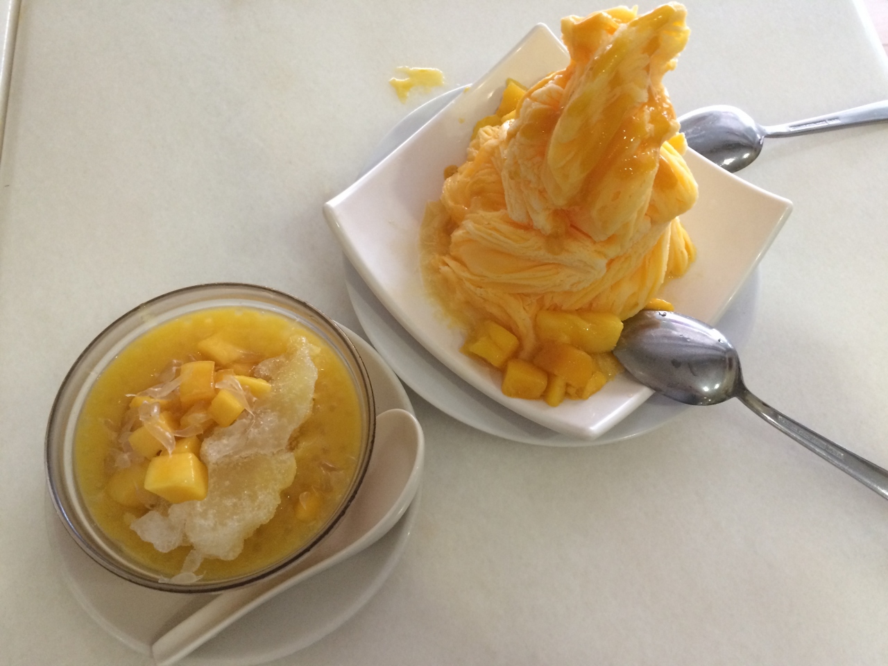 チャイナタウンにあるスイーツのお店にマンゴーのかき氷があるようで、訪れました。旦那は店の看板メニューのマンゴーかき氷、私は電車の冷房にやられていたので何か温かいものを、と思ってよくわからないけれど「mango with pomelo sago」というものを頼みました。結果、私の頼んだものは暖かいものではなく、タピオカ入りの冷たいマンゴースイーツでしたが、とてもおいしかったです。かき氷と食べ比べるとマンゴーの濃厚さがますます引き立ち、大正解の注文でした。対するかき氷はやはり味が薄くて、ちょっと人工的な味もします。店内は観光客もちらほらいましたが、地元の人たちもたくさんいるようでした。男性同士のグループでも訪れているようで、人気店の様子です。