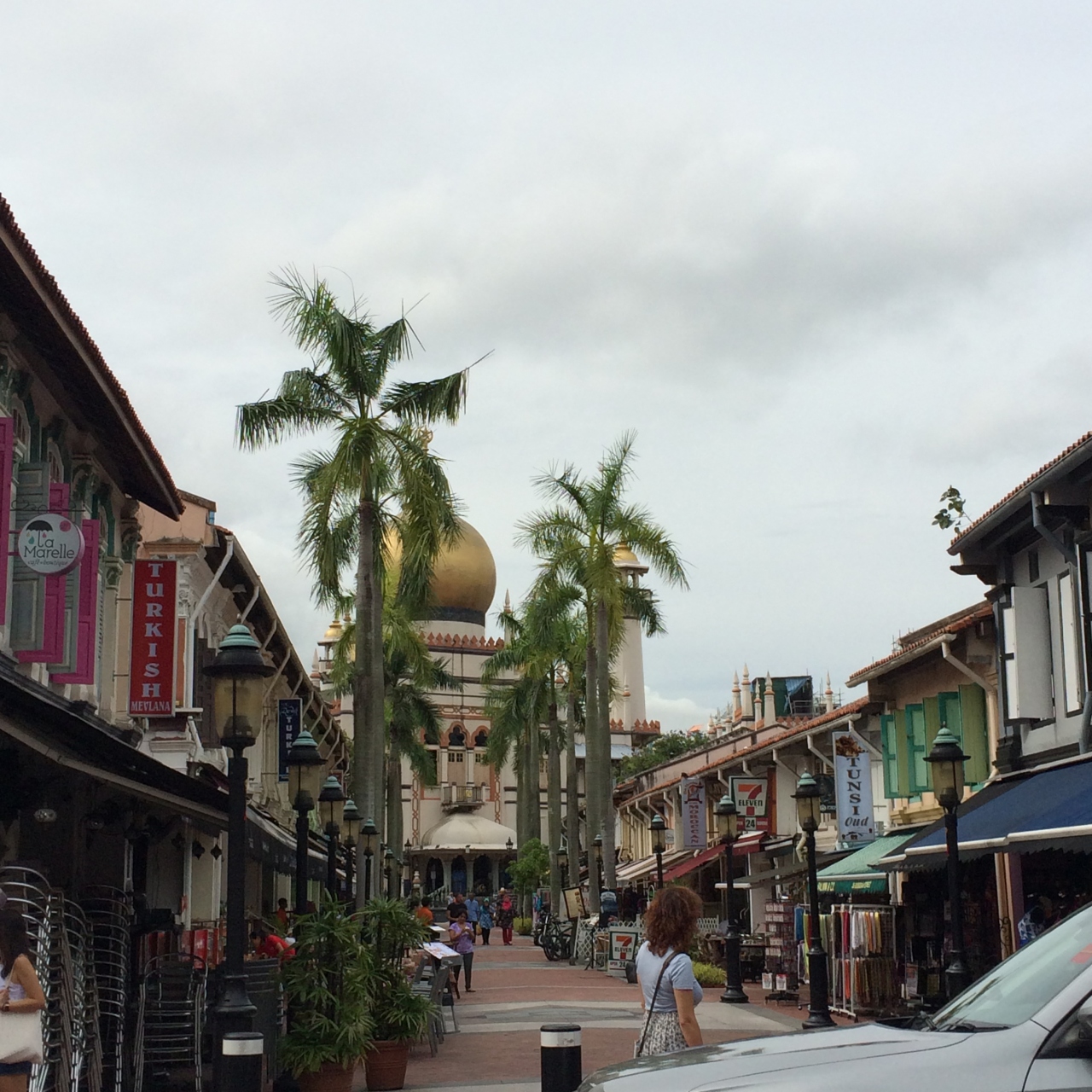 地下鉄ブギス駅から少し歩いてスルタン・モスクにたどり着きました。中も見学させてもらえて、靴を脱いで入ります。中ではメッカの方向に祈りをささげる人が見えます。二階は観光客は入れないようです。メインストリートには有名な香水のお店があるようで、それを目当てにやってきたであろう日本人観光客がたくさん見られました。ちょっと横道に入るとほとんど人がいないカフェで男性が水煙草を吸っています。興味がありましたが、お店によって28ドル、40ドル、25ドルといろいろな値段を言ってくるし、今一つ勇気が湧かず、今回はあきらめました。メインストリートにはトルコのレストランがたくさんあり、どれもおいしそうでした。トルコのお茶をポットでいただきながら食事をしているようです。おなかがすいていなかったので、我々はビールのみでしたが、次回は何か食べてみたいです。