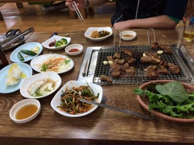ガイドさんのお勧めで行ってみた焼肉屋さんです。場所はアリラン通り近くの眼鏡屋NAVIの向かい、ということでしたが、全然見つけられずに困っていたら、親切にも地元の方が身振り手振りで教えてくれました。お店を発見しましたが、眼鏡屋さんは小さくて目印にはならないような感じでした。店内にはお座敷とテーブル席があります。頼み方がわからずにいると、店員さんがこれね、と豚のぶつ切りの焼肉を用意してくれました。キムチや野菜などがたくさん運ばれて、豚肉の登場です。もう焼いてあったものを鉄板に並べてくれたので、食べていいのかな、と手を伸ばすとまだ、と教えてくれました。この鉄板で最後まで焼くようです。食べごろも教えてくれて、親切でした。野菜にキムチとお肉を挟んでいただくととてもおいしく食べごたえがあり、満腹でした。その後、ご飯は?と次の注文を聞きに来てくれたのですが、食べられないのでお断りしました。周りの韓国の方々は、この焼肉と一緒にごはん料理も頼んでいて、それが普通のようでした。みなさん結構食べるんですね。料金もリーズナブルで、たっぷり食べて二人で24000ウォンでした。地元の雰囲気があふれるお店で、とても気に入りました。また行きたいと思います。