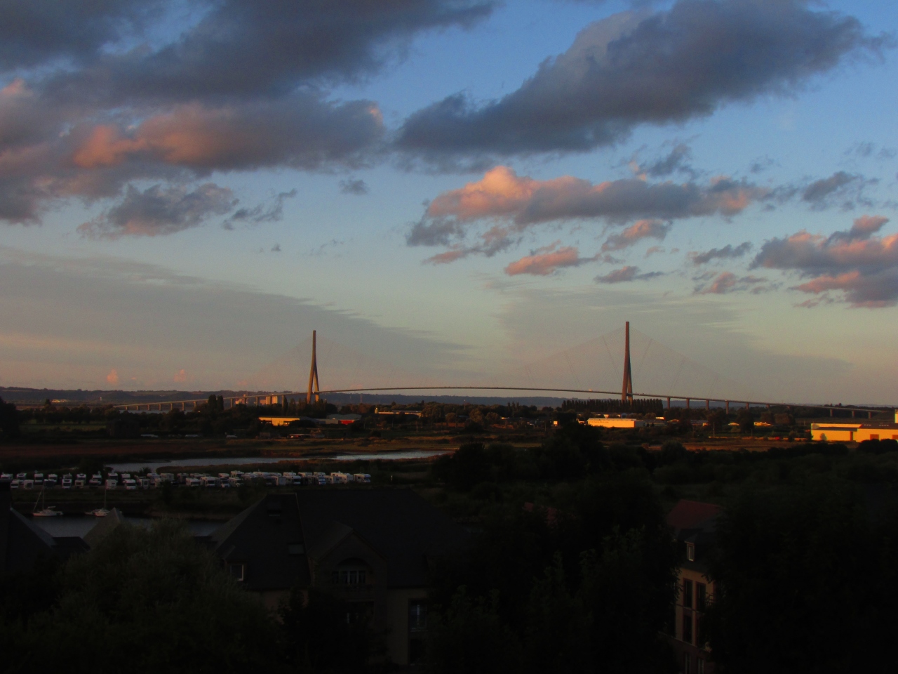 広くて美しいインテリア、大きな窓から右手にはノルマンディー橋、左手にはセーヌ川の河口、旧港が見えます。