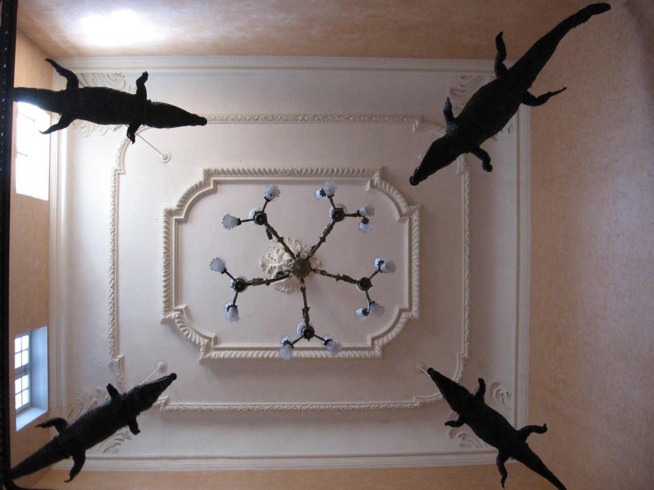 市庁舎の建物には自由に入ることができ、天井を見上げると、なんと等身大の4匹のワニが吊るされています。