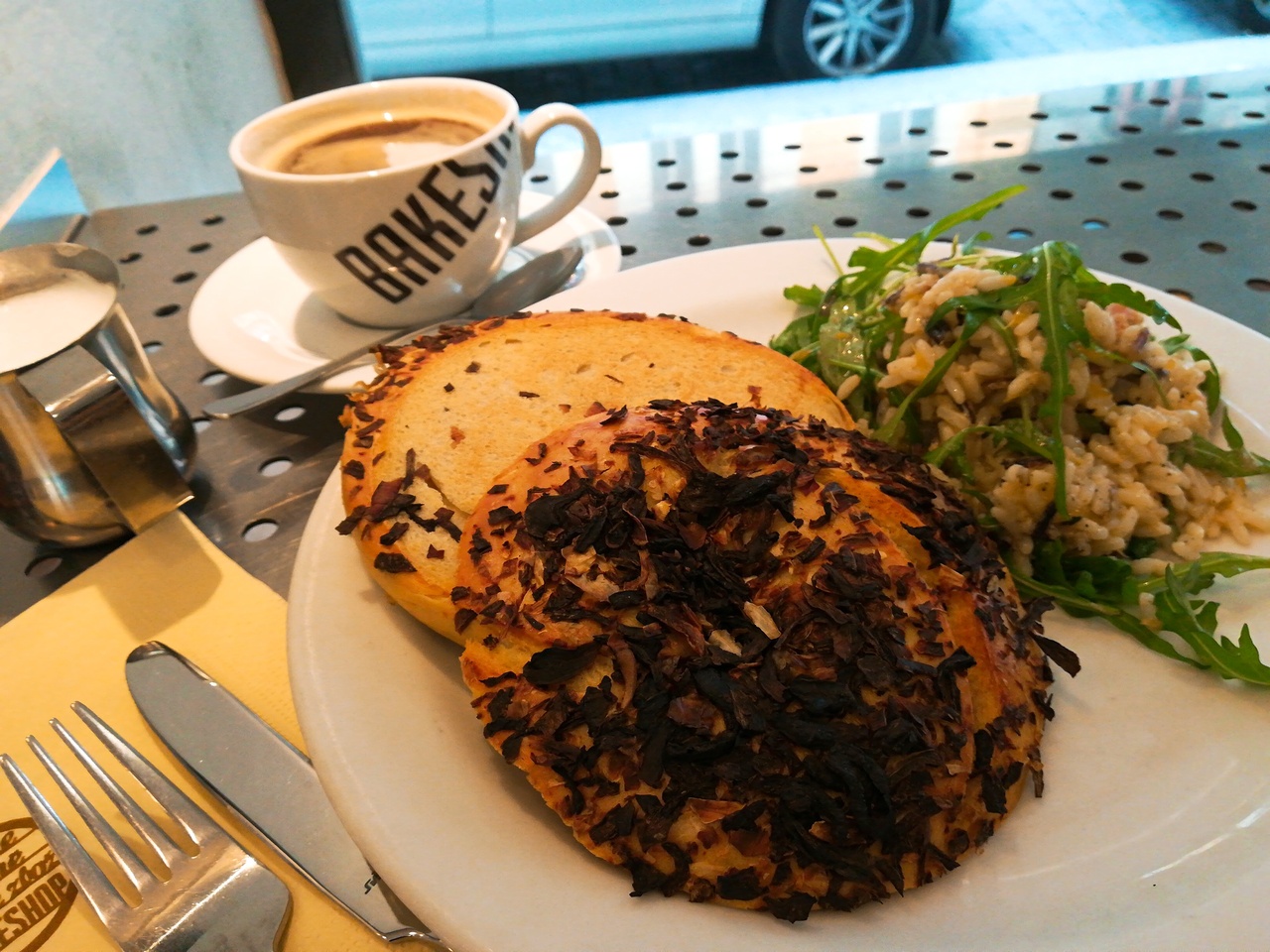 私はオニオンベーグルとグリークサラダを注文しましたが、ベーグルは焦がしオニオンが香ばしく、雑穀を使ったグリークサラダはレモンが効いていて、すっきりしたリゾットのような感じで美味しかったです。- 旅行時期