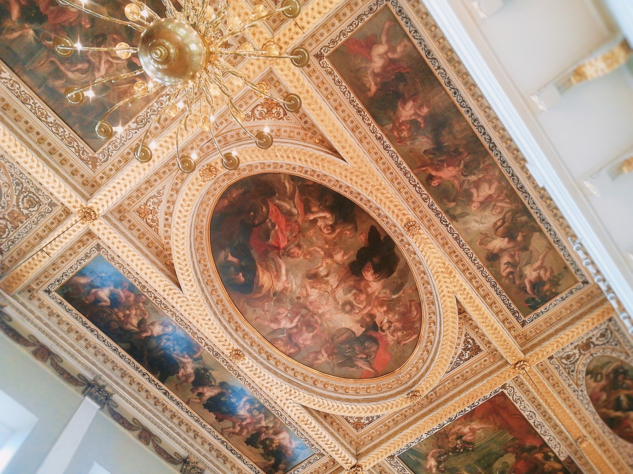 バンケティング・ハウス内の床には一人用ソファーがいくつか置いてあり、そこでくつろぎながら、歴史を感じ、美しいルーベンスの天井画を鑑賞することができるので、なんとも贅沢な時間が過ごせますよ。- 旅行時期