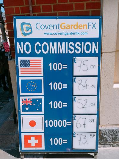 ロンドン市内で換金レートが良い場所を探したところ、手数料無料の「Covent Garden FX」というショップを発見。