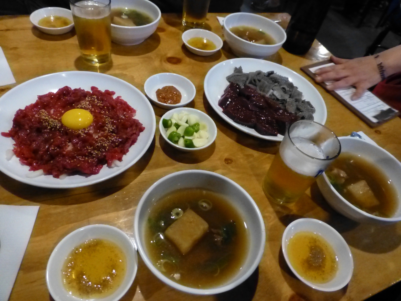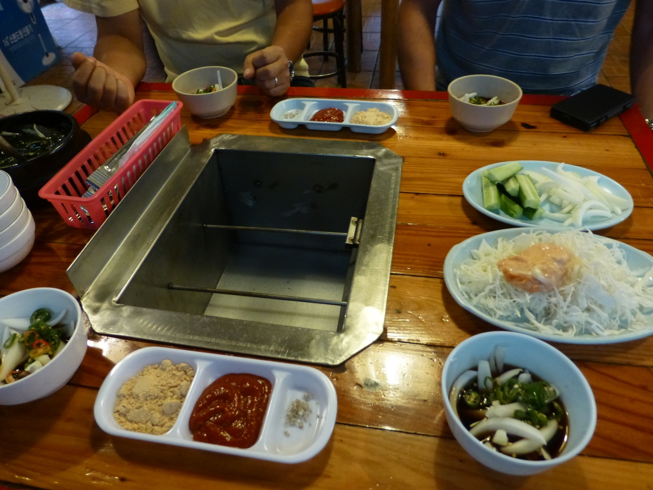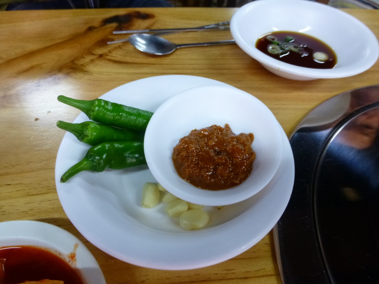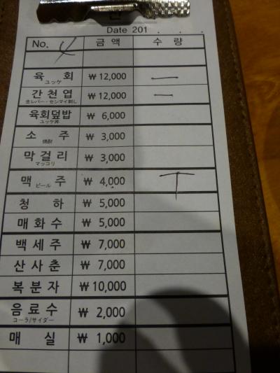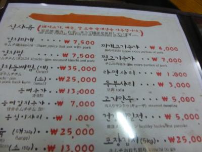 私たちは、モクサル(肩ロース)、ハンジョンサル(豚トロ)、トゥンカルビ(豚背中カルビ:スペアリブ)、サムギョプサル(豚三枚肉)、コッテギ(豚の皮)、冷たいキムチそうめん、を注文。