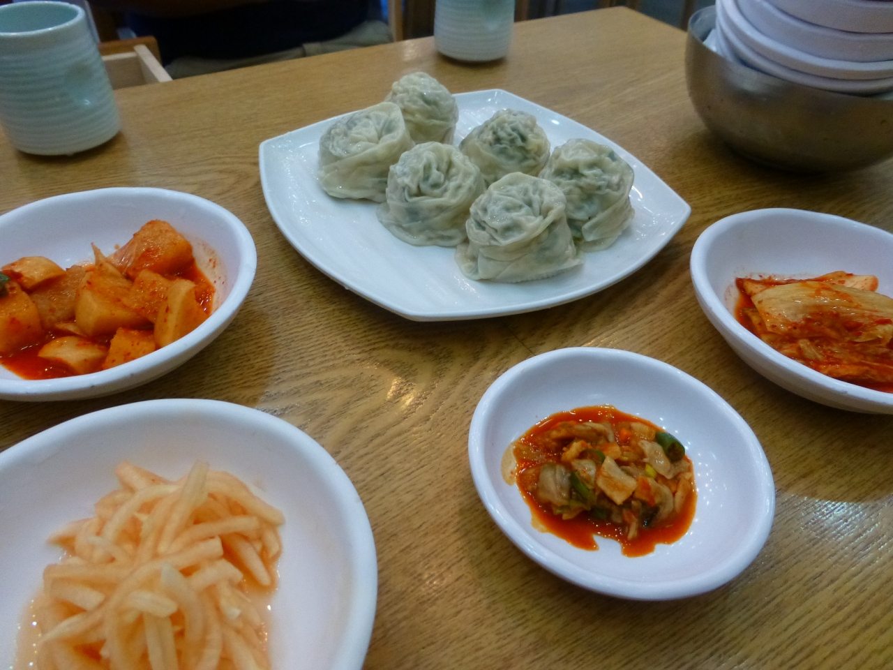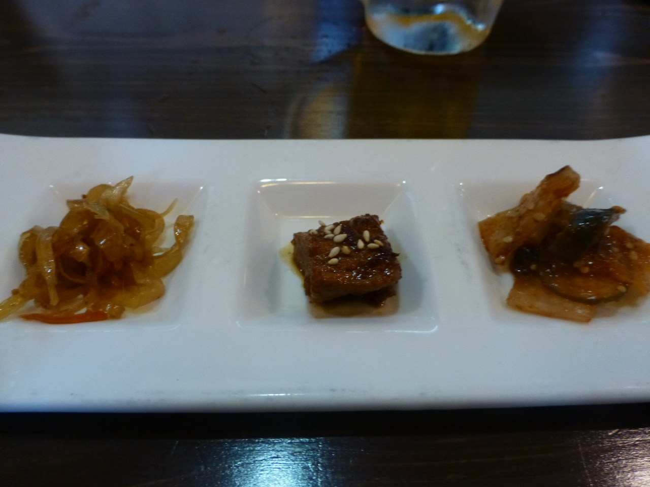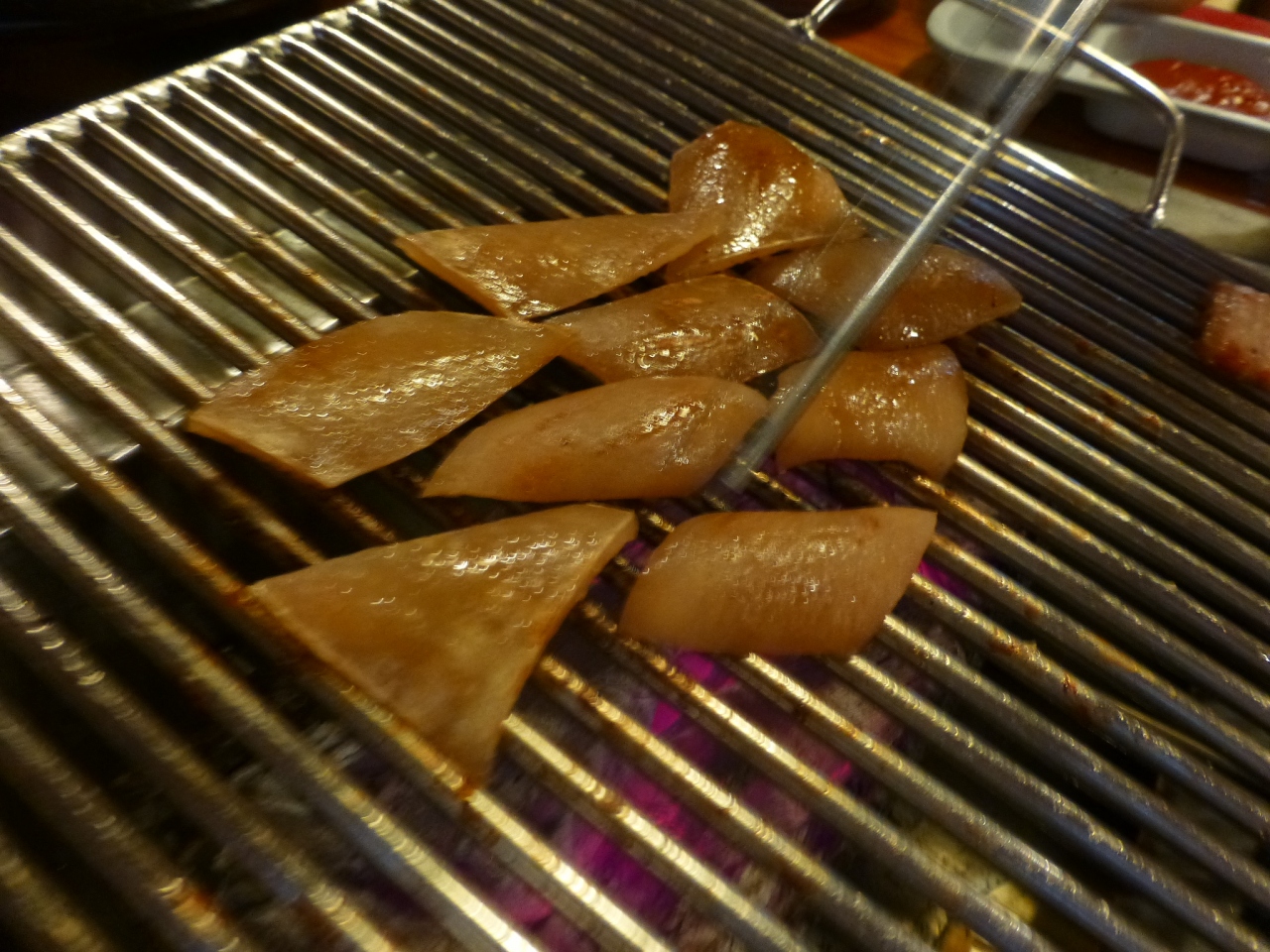 私たちは、モクサル(肩ロース)、ハンジョンサル(豚トロ)、トゥンカルビ(豚背中カルビ:スペアリブ)、サムギョプサル(豚三枚肉)、コッテギ(豚の皮)、冷たいキムチそうめん、を注文。