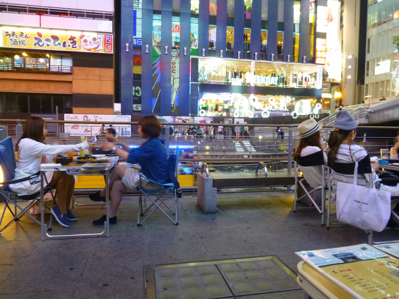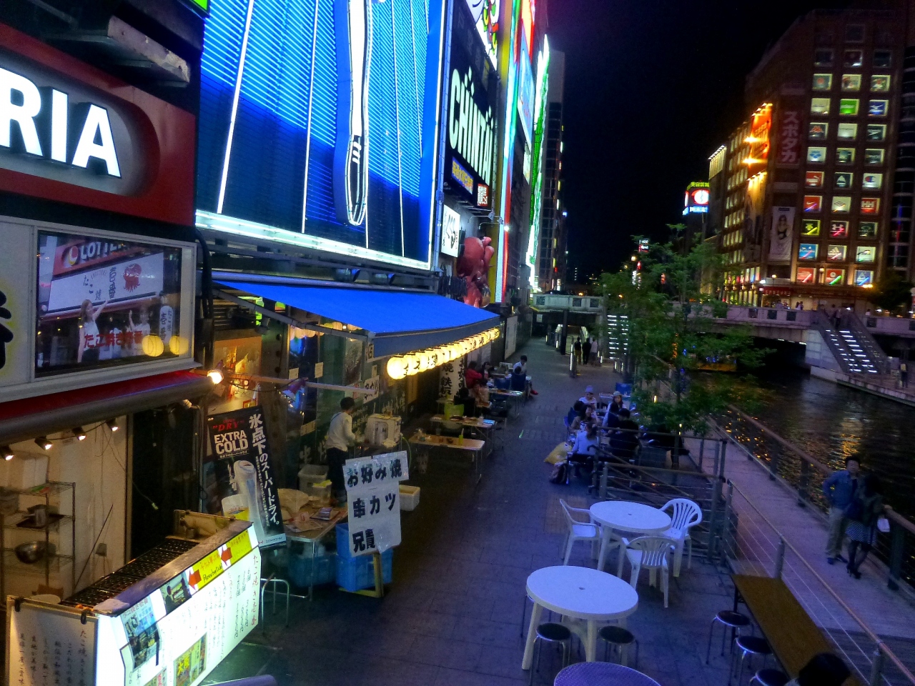 そこは、グリコの看板のビルのお店が、外の川沿いにテーブルと椅子を出して