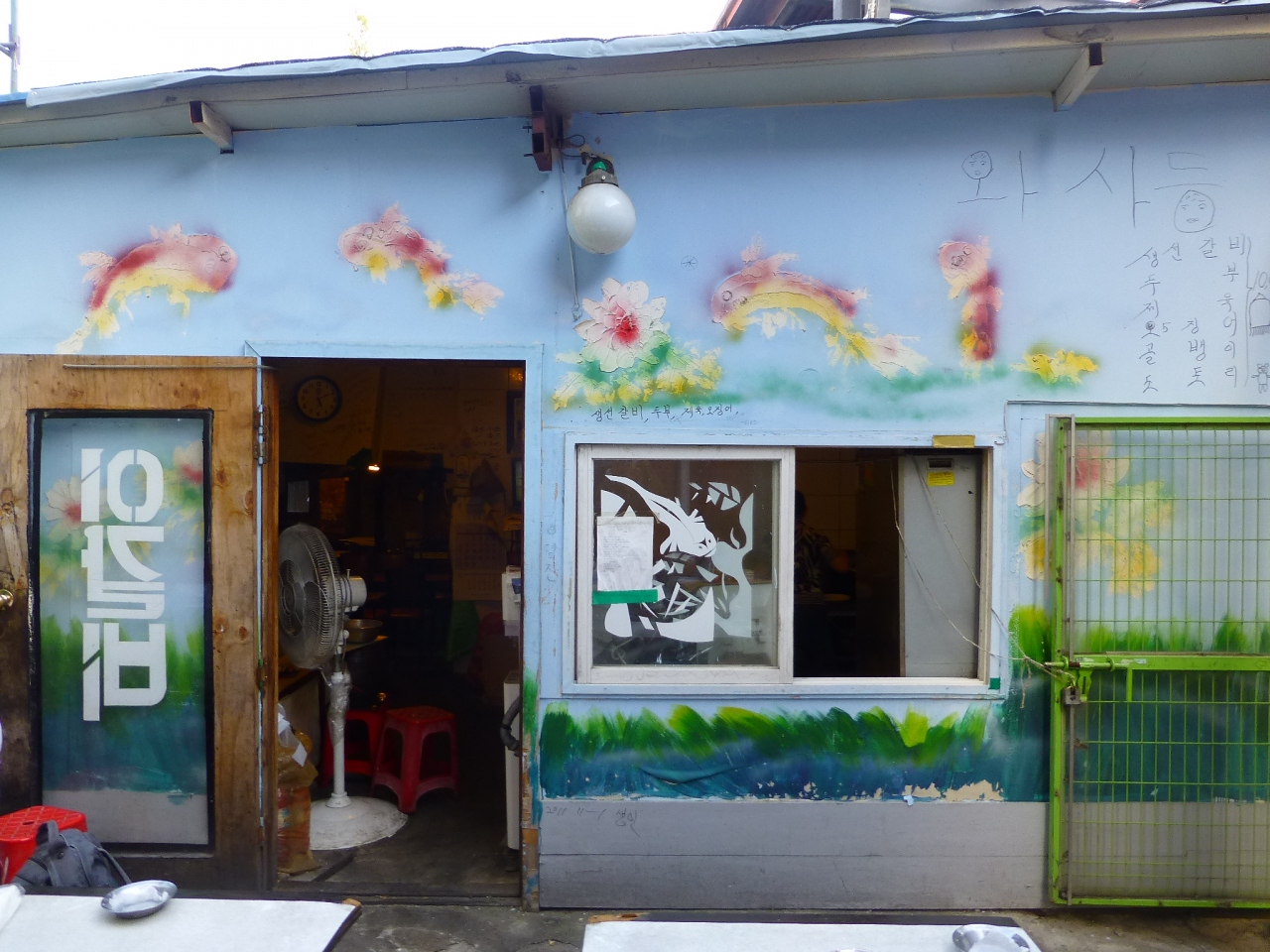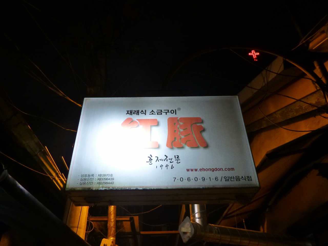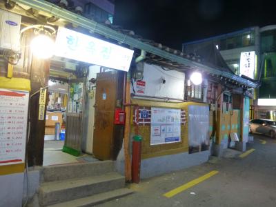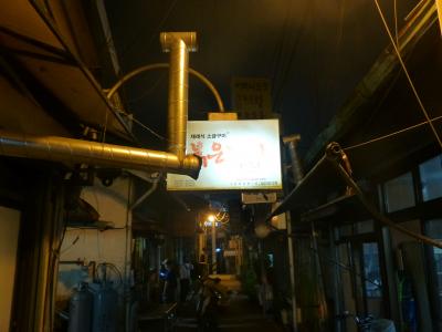 龍山(ヨンサン)の電子商店街の裏路地にある、独自製法の燻製豚焼肉の店『紅豚(ホンドン)』。