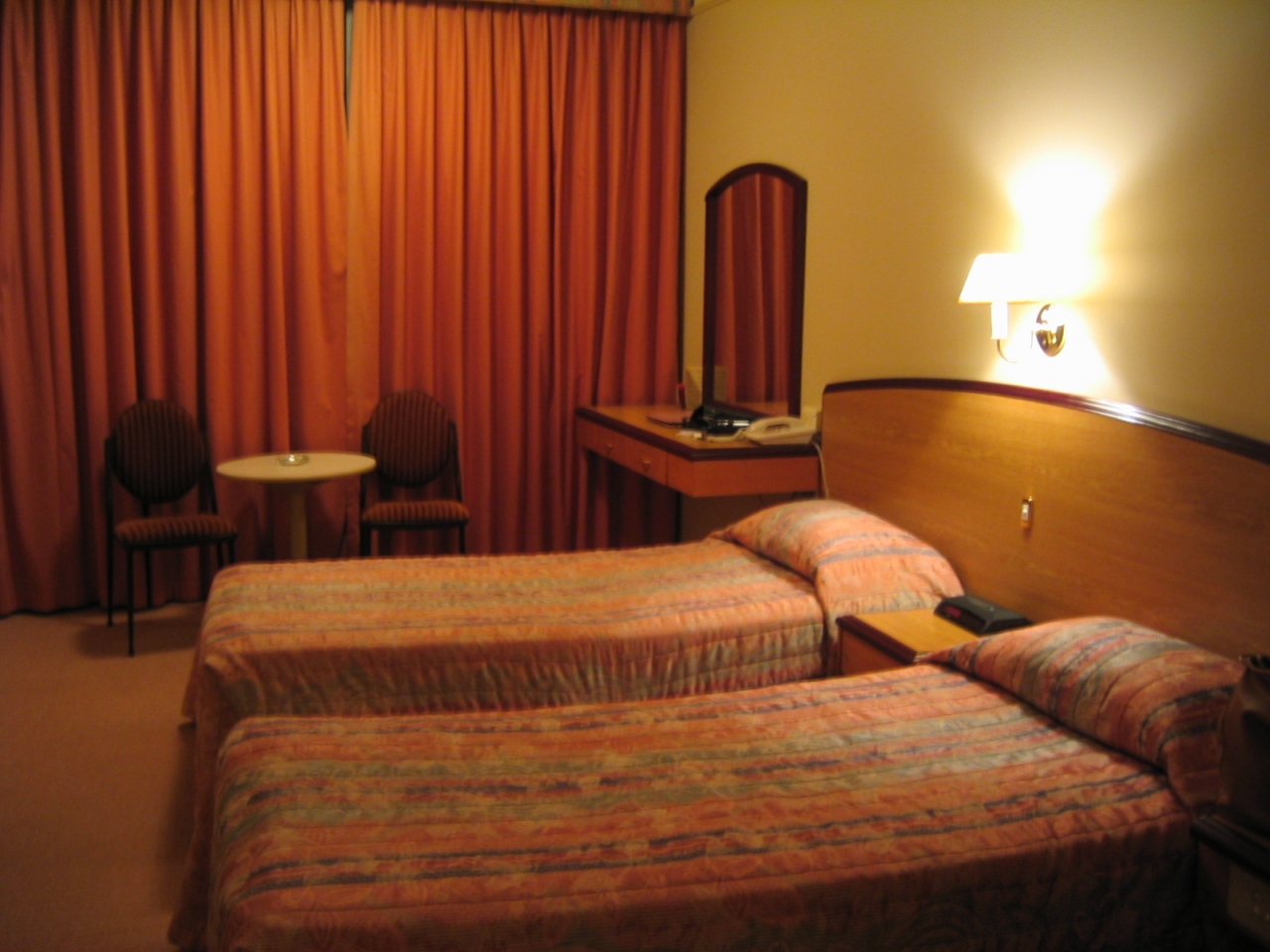 市内中心部から離れているので、買い物には不便です。市内中心部まで歩くと40分もかかります。バスを利用するのがよいと思います。ホテルの目の前にバス停がありますが、このバスがどこを通って、どこまで行くのか確認していないので不明です・・・ごめんなさい。それほど大きなホテルではないので、客の出入りによる喧騒さはあまり感じられません。日本人スタッフはいないと聞いたのですが、日本人の男性スタッフがいました。でも、その方一人しかいないようなので、いつも日本語で対応できるわけではありません。ダブルベッド、シングルベッドそれぞれひとつずつ置いている部屋に泊まりました。結構広めの部屋だと思います。つくりは少々古いのですが、バスルームは清潔です。道路をはさんだ対面にはローズガーデンがあり、朝に散歩している宿泊客が何名かいました。