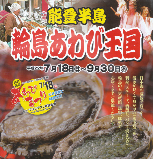 今年の夏はとにかく暑い、猛暑である。南国の国日本である。熱帯の国になりつつある日本。こんな時こそ旅に出よう。どこか涼しい所はないかとネットで探す。そんな時目にしたのが涼しい日本海、食すは輪島アワビ、「能登半島・輪島あわび王国」イベントのキャッチコピーである。今では数少なくなった輪島の海女さんが素潜りで獲ってくる日本海のアワビ、肉厚で磯の風味豊かな刺身は品があり実に旨いの一言、食通にはたまらない逸品である。輪島のあわびは自分へのご褒美と2011年夏・最高の贅沢である。