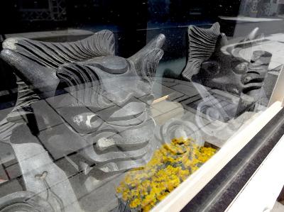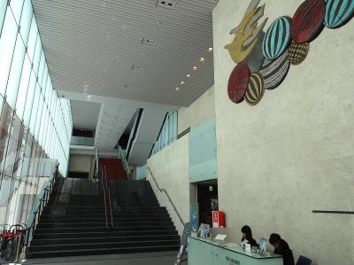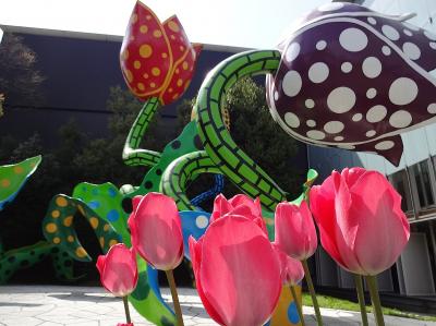 敷地に入るとまず目に止まるのが、建物のガラスに描かれた大きな犬の絵と巨大なチューリップのオブジェ。共に草間作品ですが、巨大なチューリーップは「幻の華」と名付けられています。