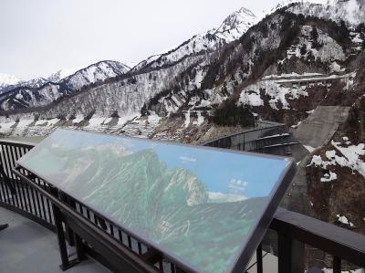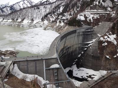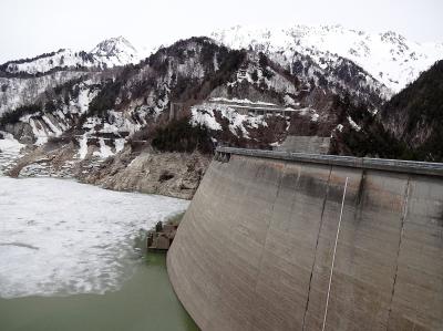 4月の黒部ダムにはまだ雪が残り、黒部湖には氷がはっています。