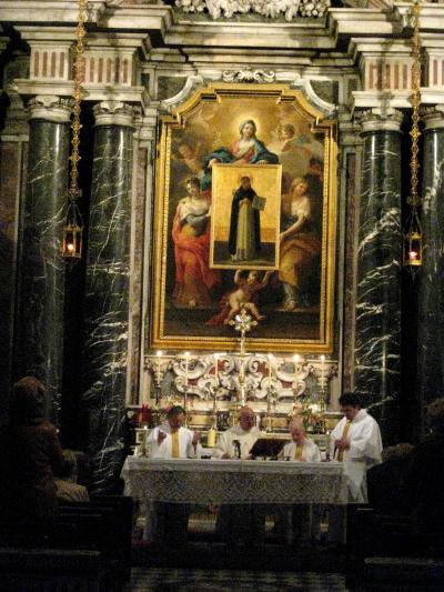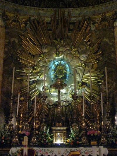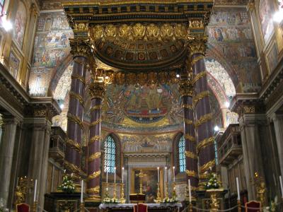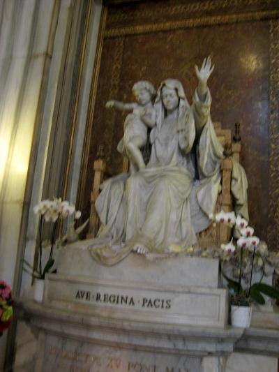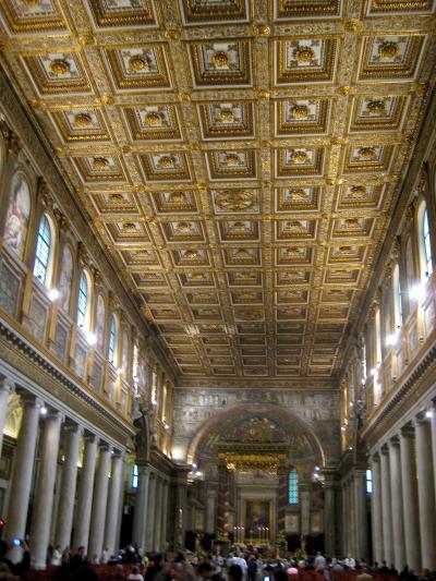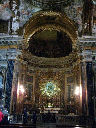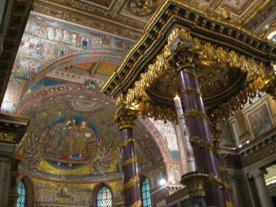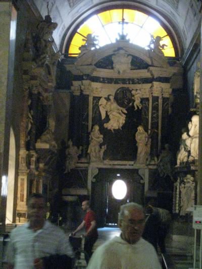 内部の雰囲気は、崇高かつ荘厳で、中央の主祭壇は、立派な天蓋で覆われ、その祭壇の下にはこの教会で最も貴重な聖遺物「キリスト誕生の際に眠ったかいば桶の木片」が収められているそうで、主祭壇の右側の床には、巨匠ベルニーニのお墓もあります。