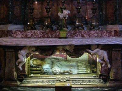 主祭壇に向かって左手には、巨匠ベルルーニの傑作「聖テレーザの法悦」が置かれ、ドラマの一場面のような表情を見せる。背後の神秘的な光の前で、神の愛に心を射抜かれようとしている聖女テレーザの表情と矢を持つ天使の恍惚とした表情が、見る者の心を射抜きます。
